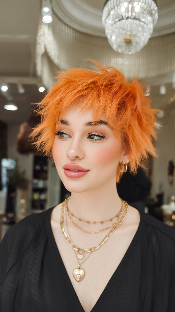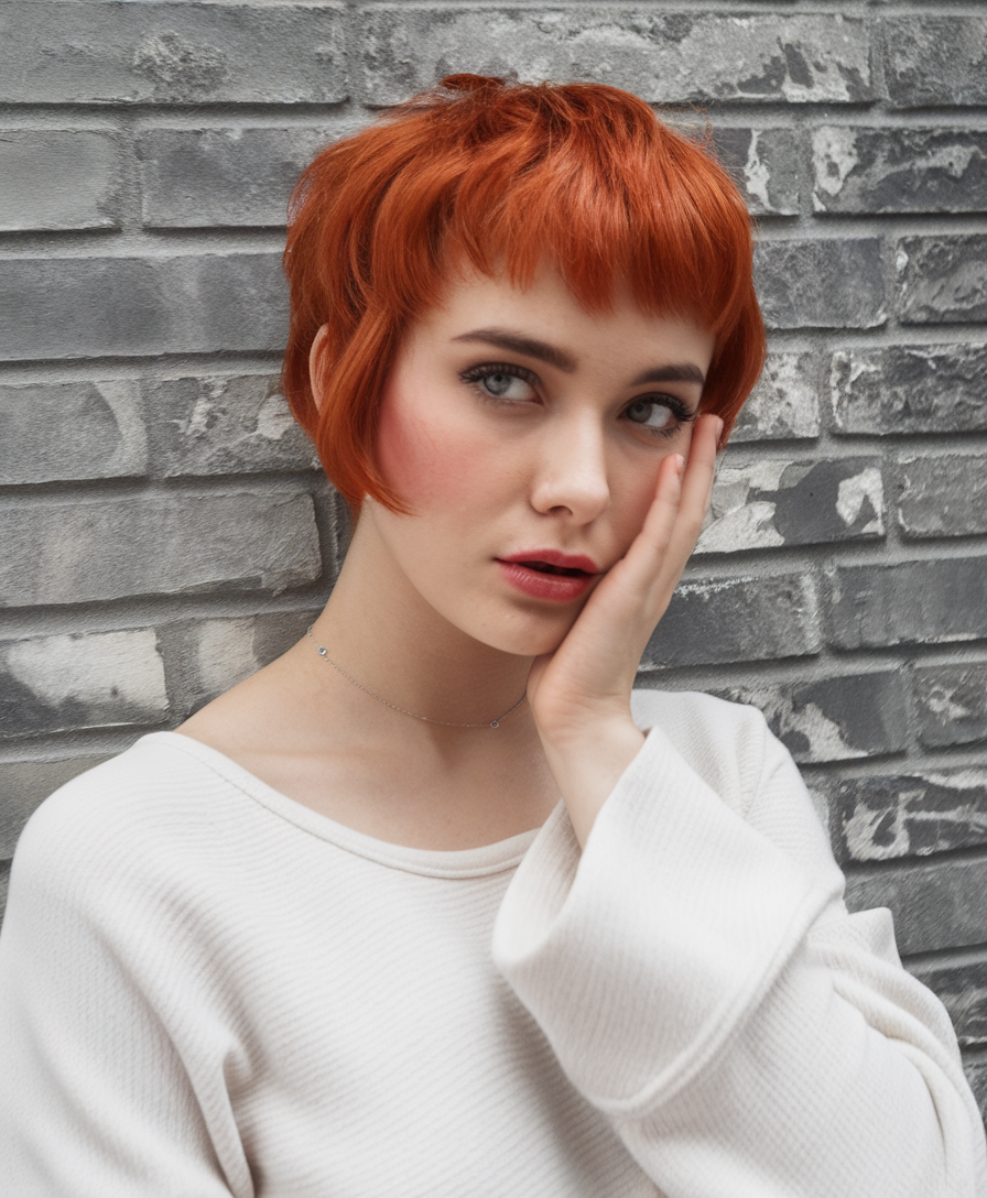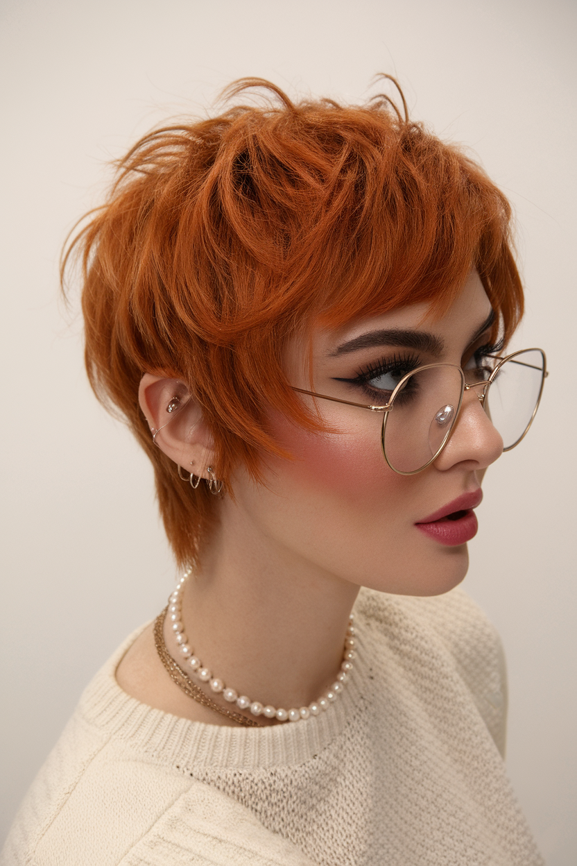 This trendy ginger pixie cut is full of texture and movement, giving it a fun and effortless vibe. The messy, layered finish adds volume, making it ideal for thick hair or those who love a more relaxed look. The feathered bangs complement the overall shape, creating a youthful and modern style. A perfect choice for women who want a fresh, lively spring pixie haircut 2025.