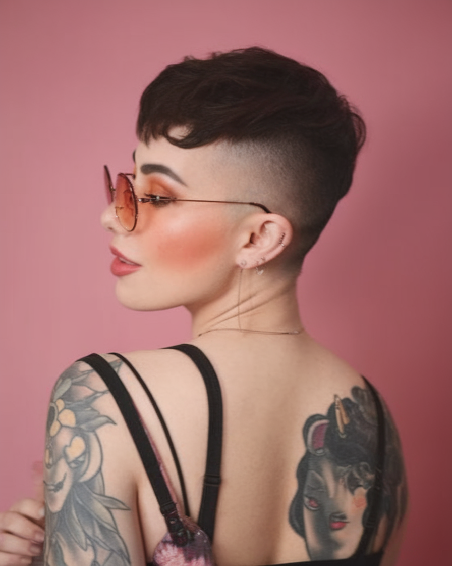 This trendy ultra short pixie features a striking undercut that contrasts beautifully with the wavy top. The deep brunette shade enhances the grunge aesthetic, making it a perfect choice for those who love edgy modern styles. The micro bangs add a daring touch, balancing the shaved sides for a sharp and confident look. A must-try for women embracing bold spring pixie haircut 2025 trends.