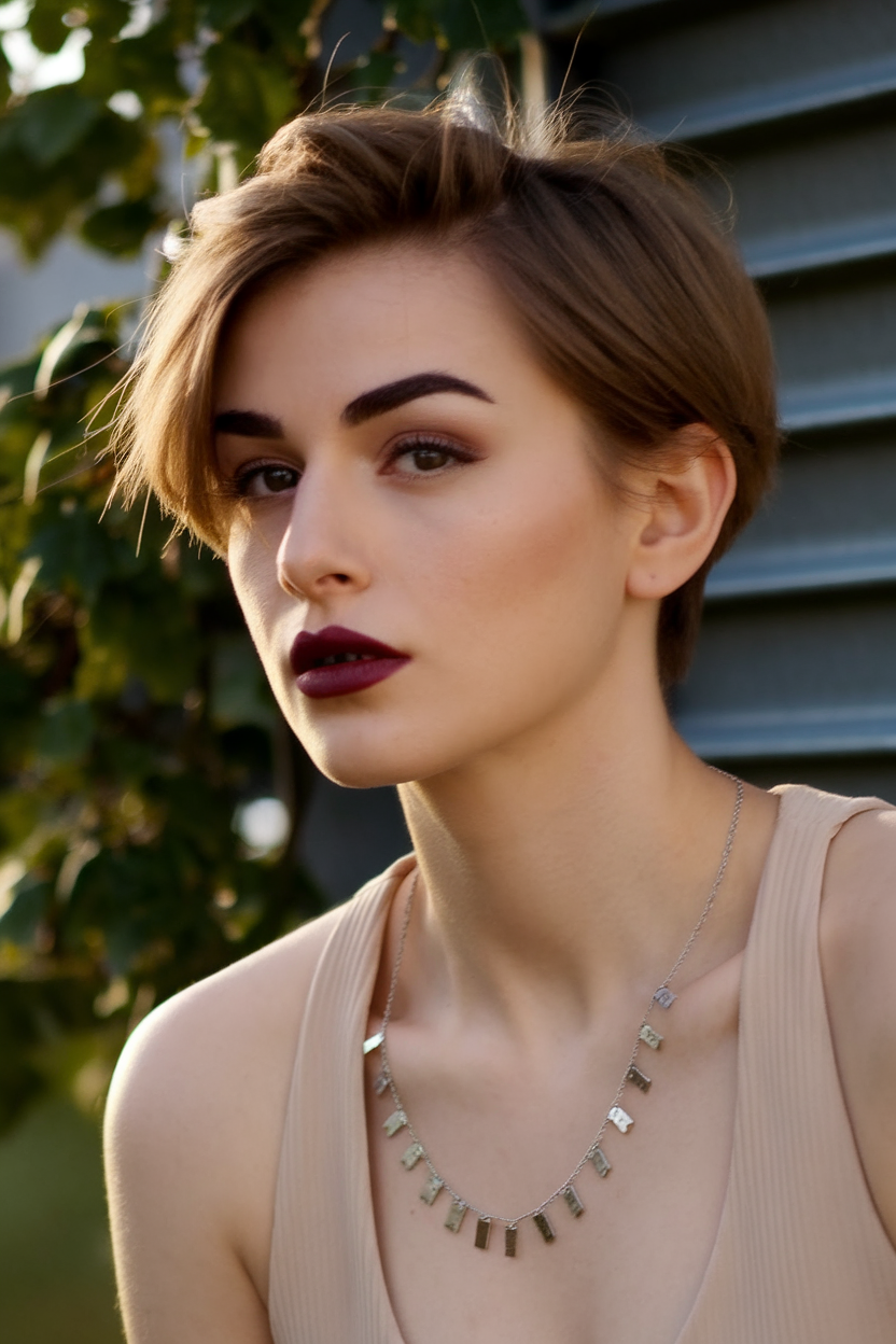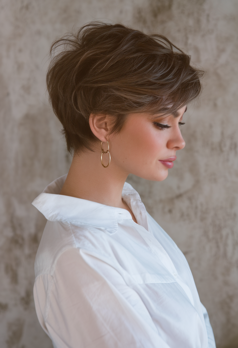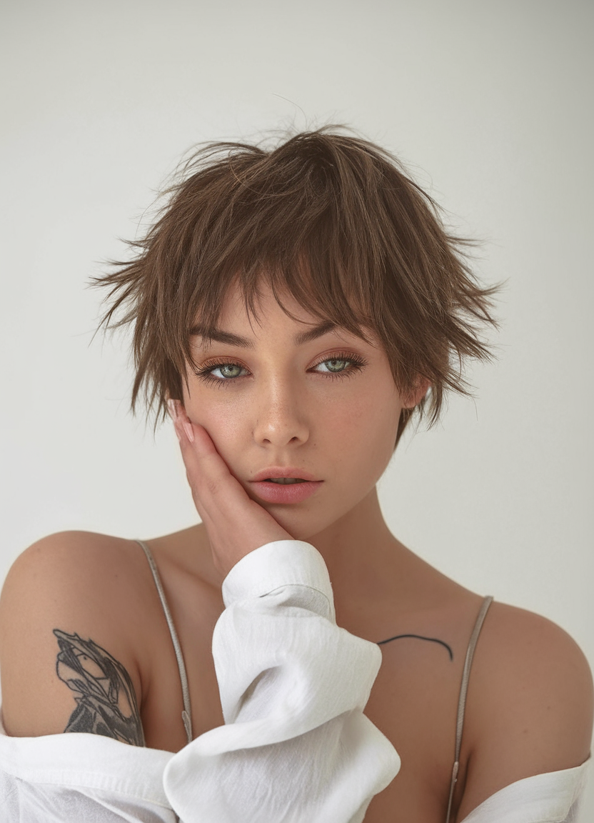 This grunge-inspired short pixie features choppy, messy layers that create a dynamic and youthful feel. The deep brunette shade adds richness, making it a bold yet effortless choice for trends women. The shaggy texture enhances the natural volume, giving it a slightly 90s aesthetic. A great style for those who love undone, modern haircuts.