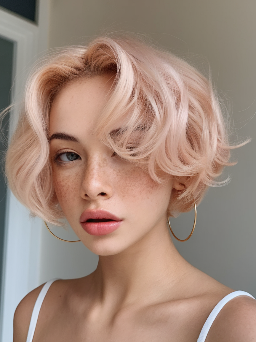 This spring pixie haircut 2025 merges a short bob with feminino ondulado waves for a soft, effortless look. The pastel pink color adds a fresh and trendy touch, making it a perfect option for women embracing modern hues. The subtle curls enhance the airy volume, ideal for those with curly hair or natural waves. A beautiful blend of femininity and playful charm.