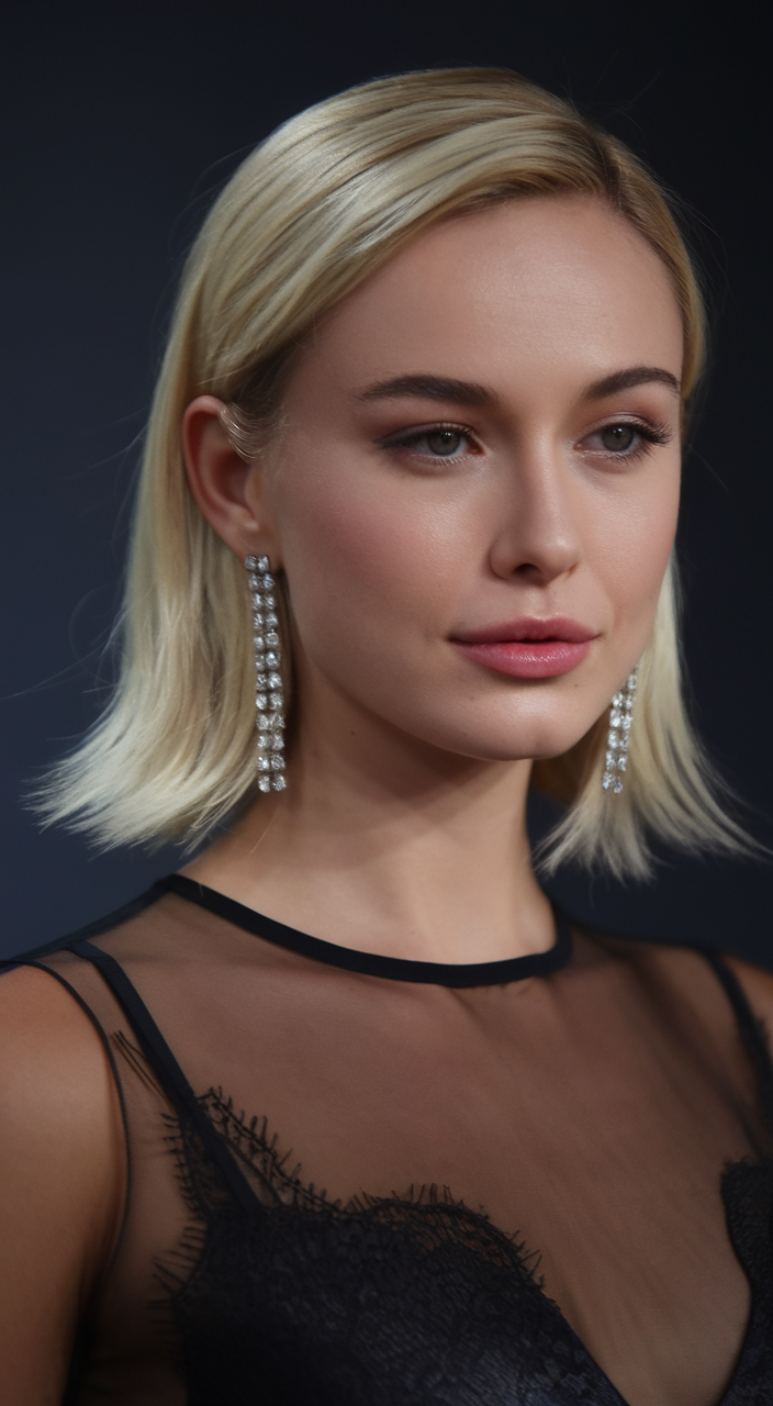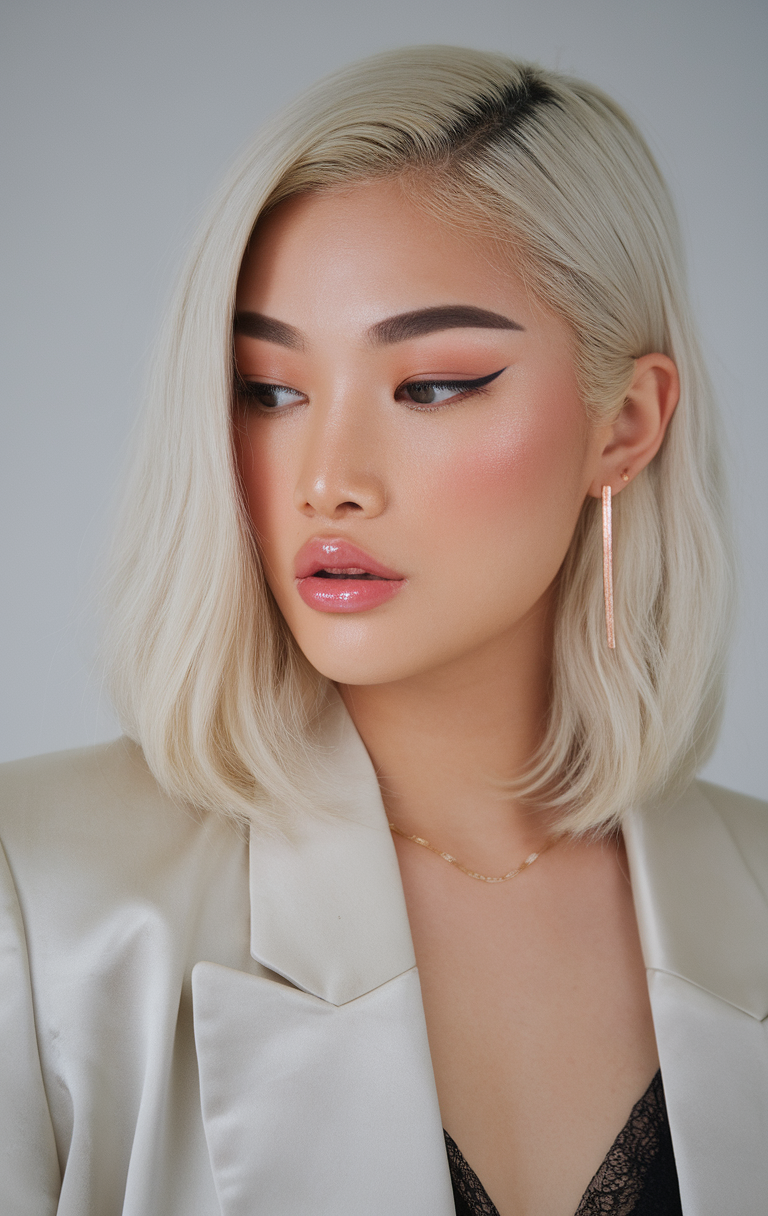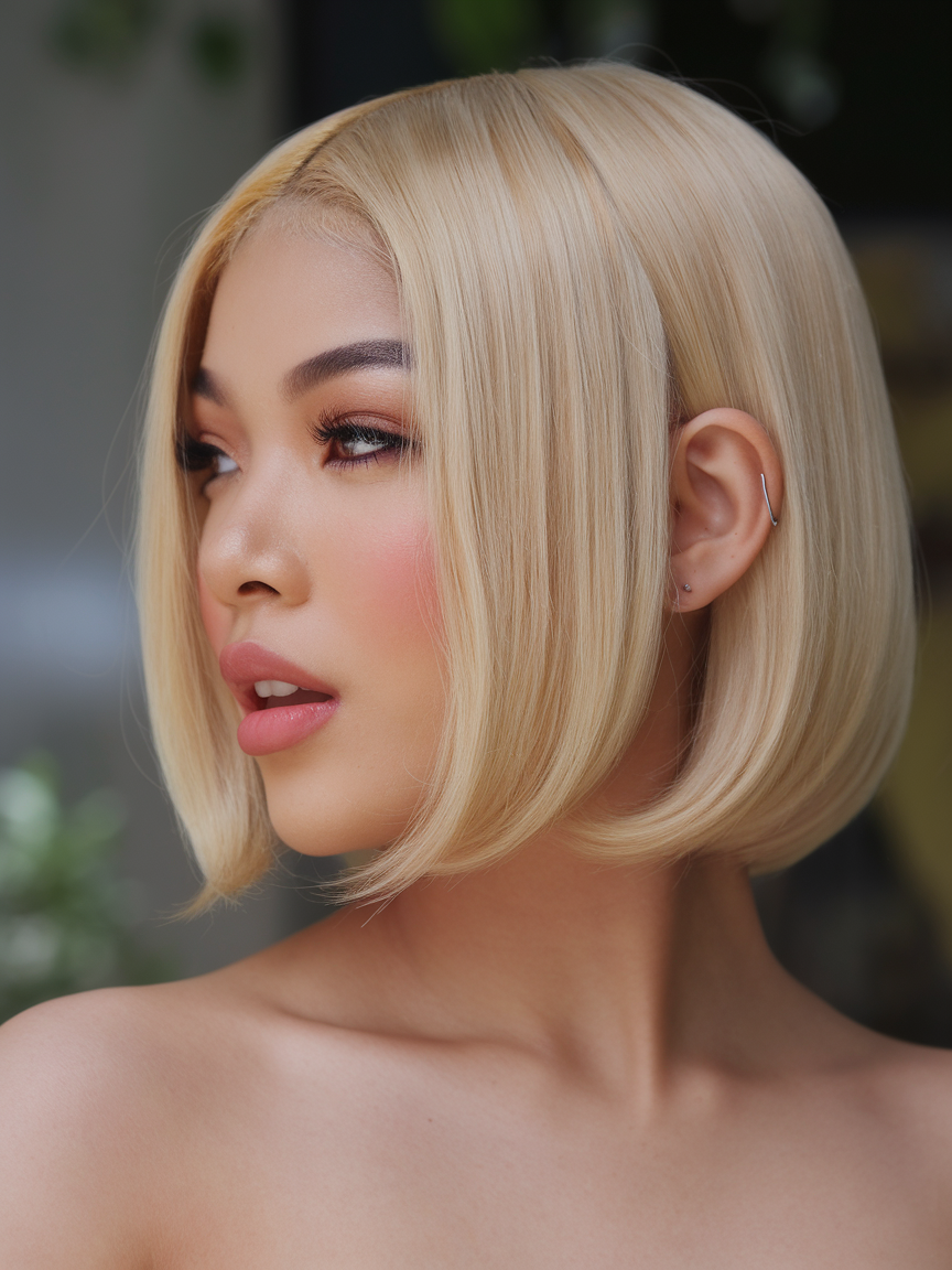A sleek, asymmetrical lob in platinum blonde creates a polished, professional appearance. The deep side part adds dimension, while the blunt ends give the haircut a contemporary edge. This look is perfect for individuals aiming for a balance between elegance and modernity.