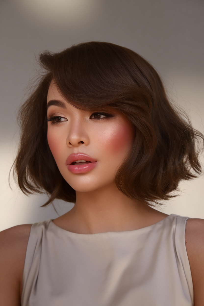 This short wavy brunette bob features soft waves that create volume and texture. The side-swept fringe complements round faces and enhances the overall charm of the cut. A versatile and chic choice for spring short haircuts ideas 2025, this look works well for both casual and formal occasions.