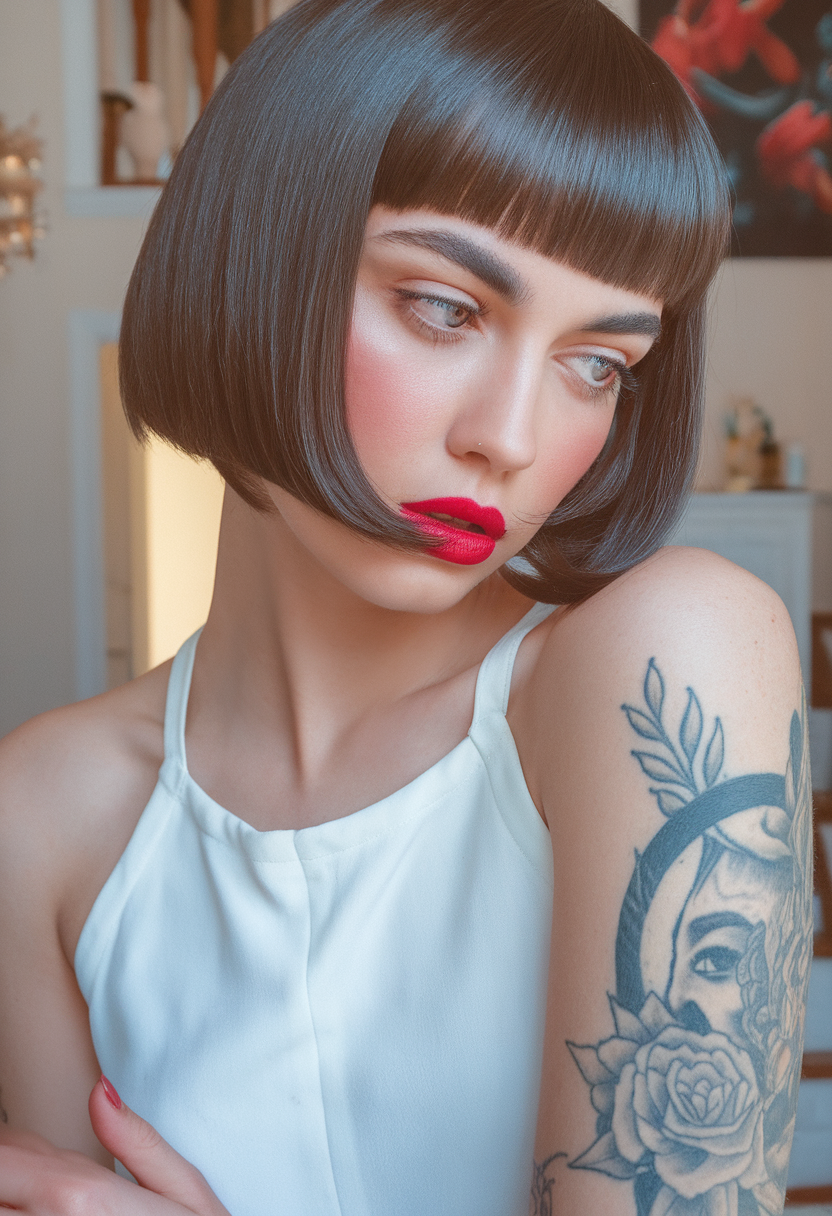 This classic black bob with straight bangs is sleek and bold, perfect for women seeking a statement look. The blunt cut frames the face beautifully, ideal for round face straight hair styles. A standout option for spring short haircuts ideas 2025, this look is timeless and dramatic.