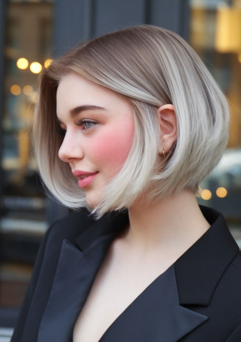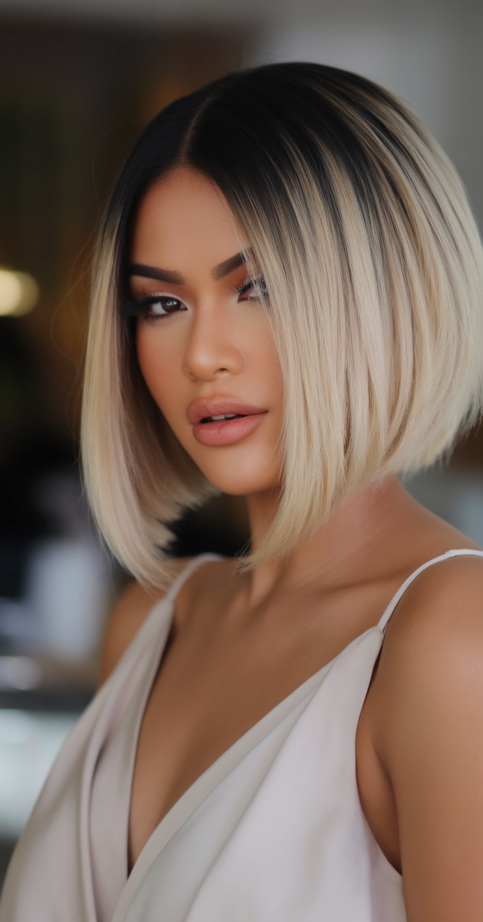 This blunt bob features a dramatic contrast between the darker shadow roots and the light platinum blonde lengths. The sharp, clean cut of the bob adds sophistication, while the shadow root makes it a trendy, easy-to-maintain option. Ideal for someone seeking a bold and eye-catching style.