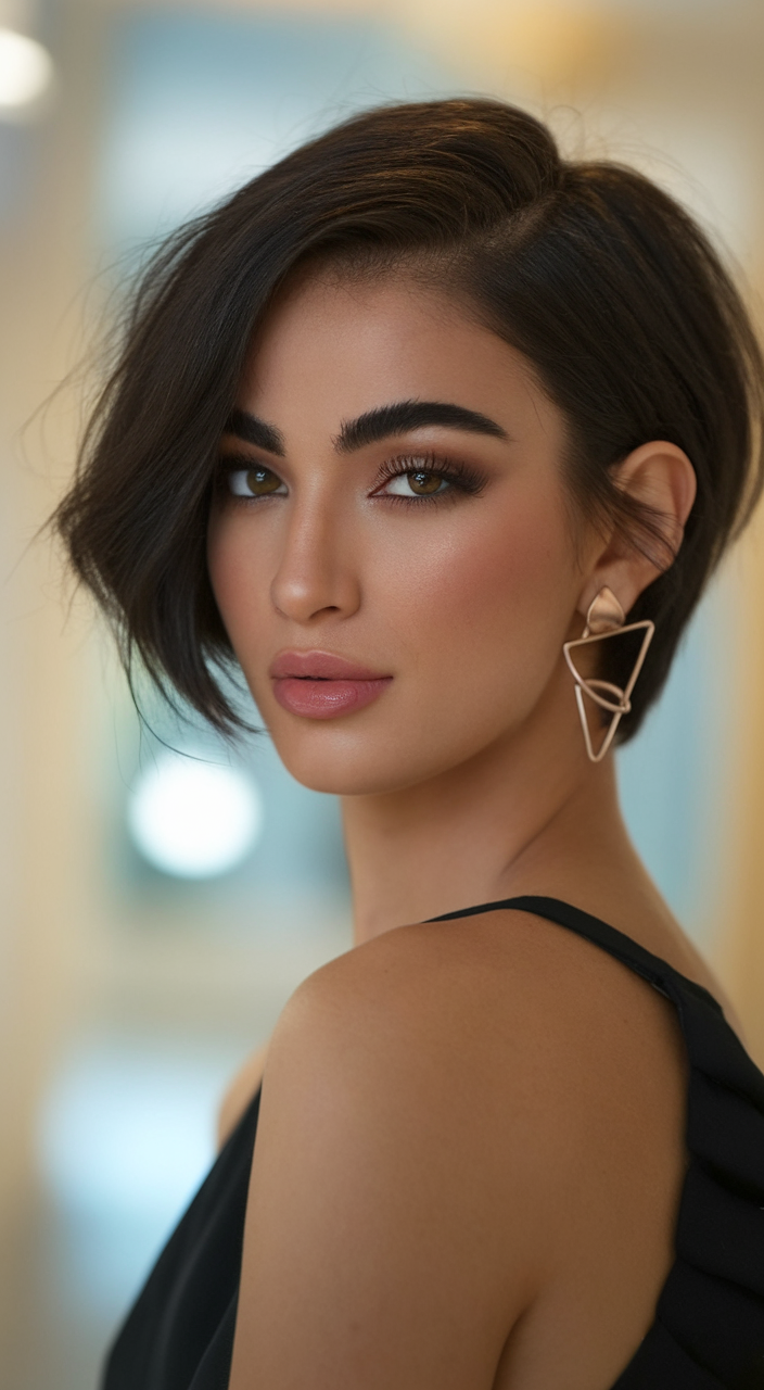 This sleek, side-parted brunette bob is styled with precision, offering a sophisticated and clean finish. Ideal for thick hair, it frames the face beautifully and works well for round faces. A go-to choice for spring short haircuts ideas 2025, it’s bold and versatile.
