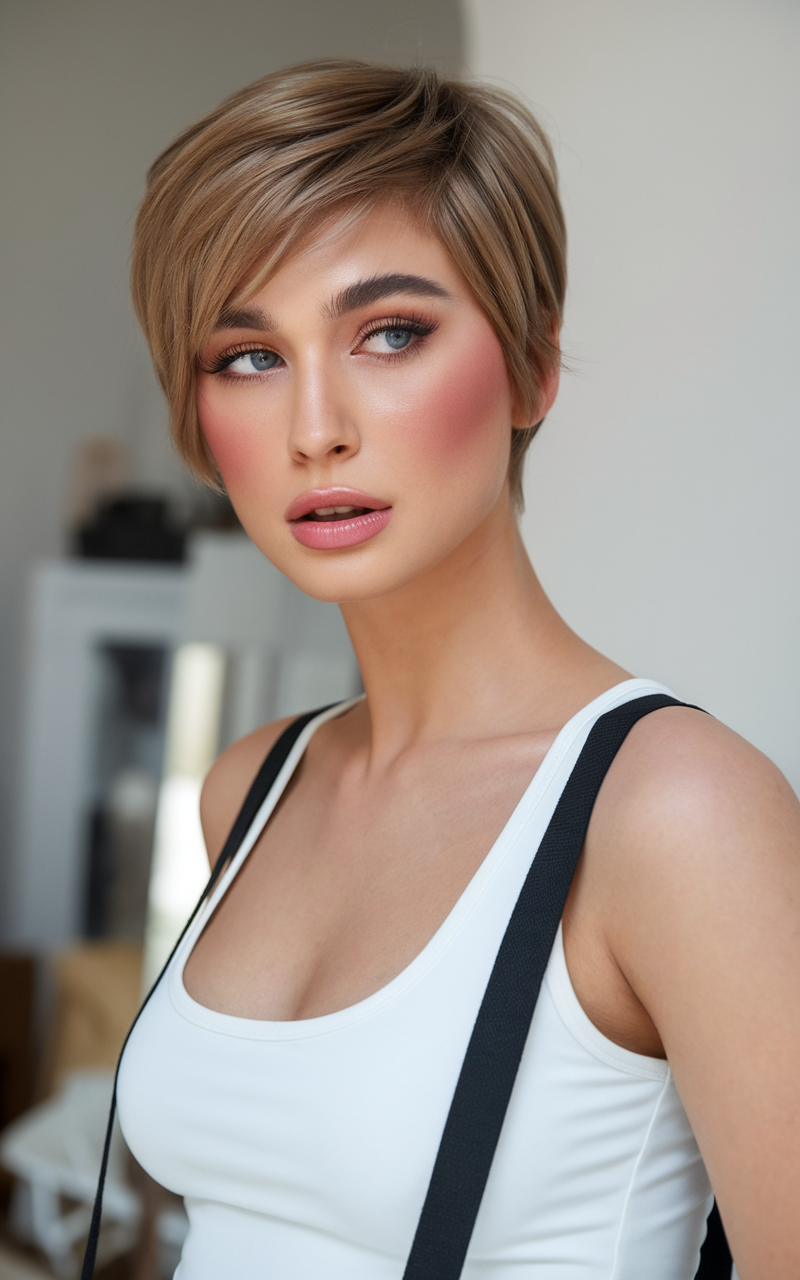 This polished pixie cut features soft side-swept bangs, blending modern structure with subtle femininity. The light brown shade adds warmth, making it ideal for spring short haircuts ideas 2025. Perfect for women with round faces, this style balances sophistication and practicality.