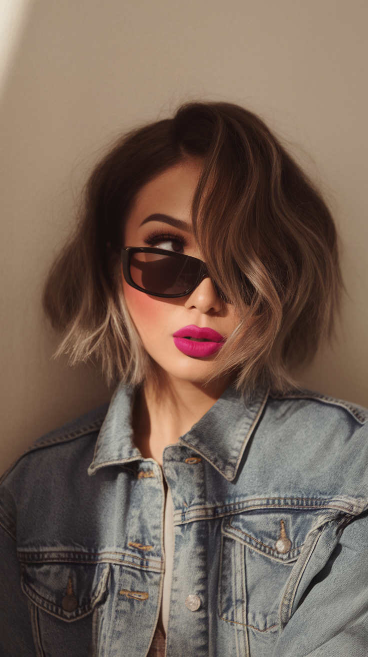 This bold, two-tone wavy hair bob combines dark roots with a platinum blonde wave for a striking contrast. The soft layers provide movement and dimension, making it ideal for women with shoulder-length hair. Perfect for spring short haircuts ideas 2025, this edgy style is both trendy and unique.