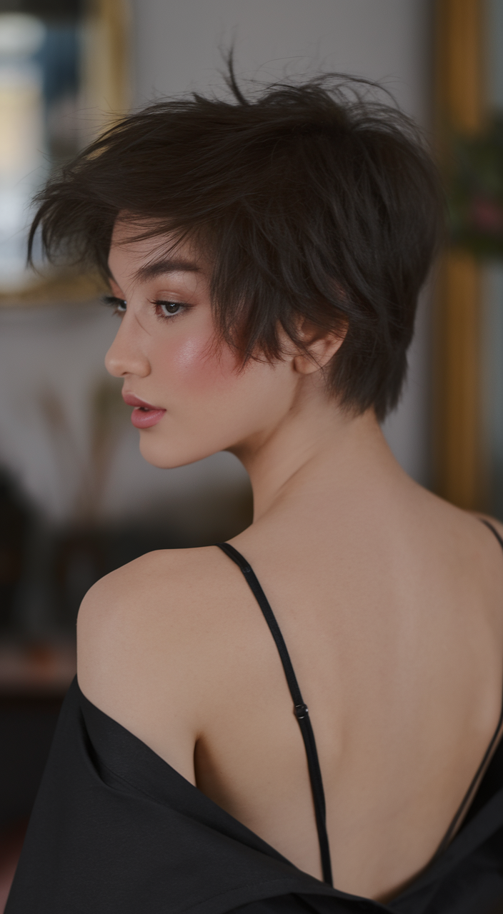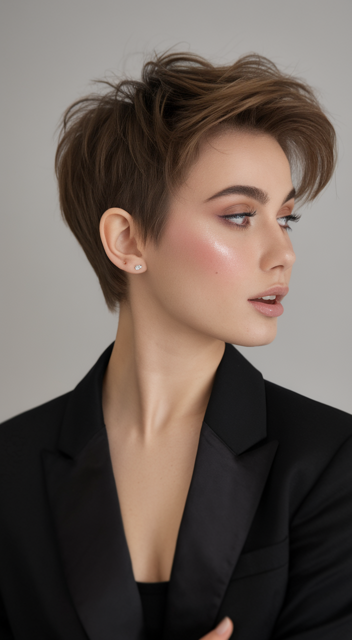 This textured pixie cut is accentuated with lifted layers for added volume and movement. Its rich brown tone enhances depth, complementing thick hair and angular face shapes. A bold yet practical choice for spring short haircuts ideas 2025, it exudes confidence.