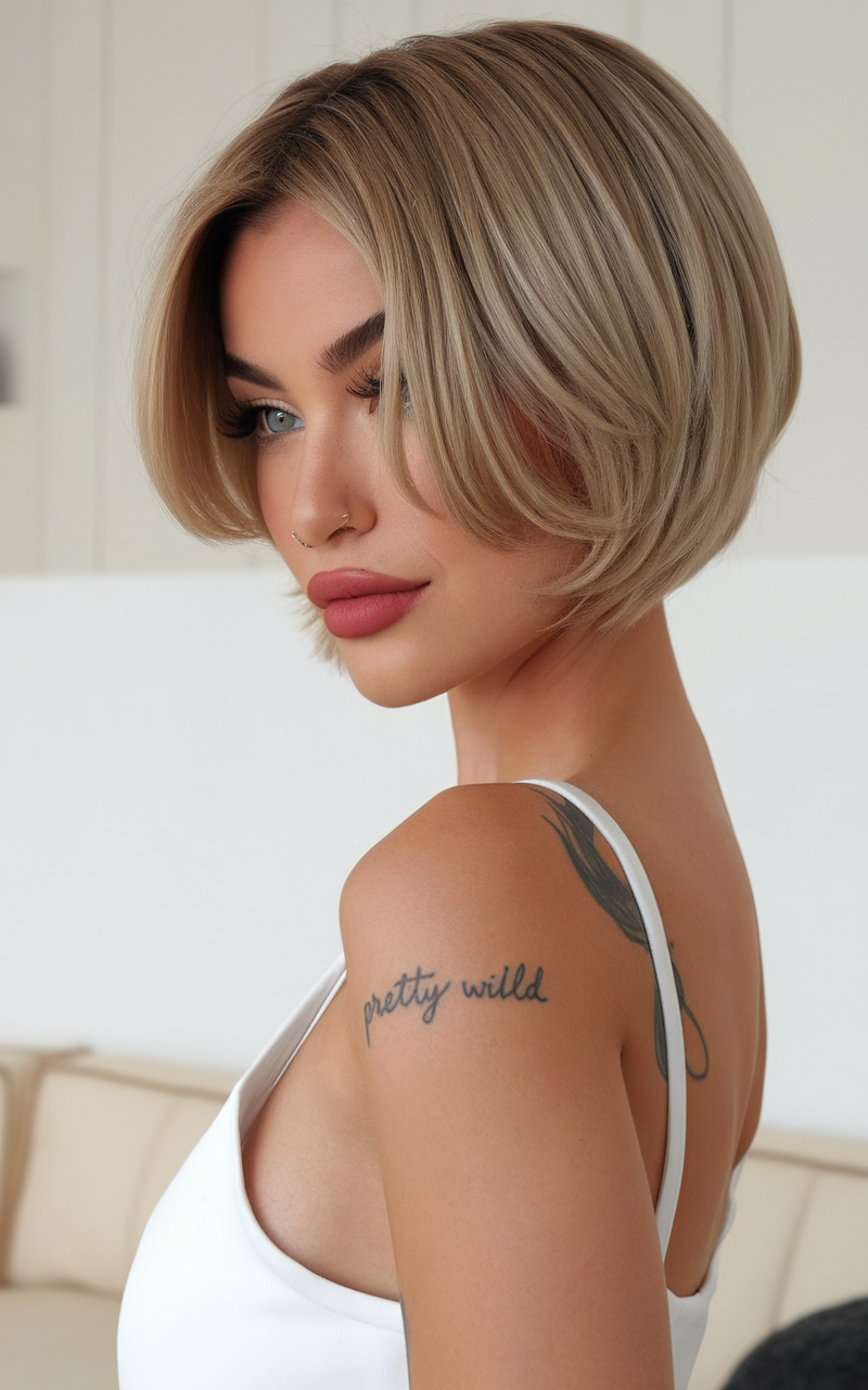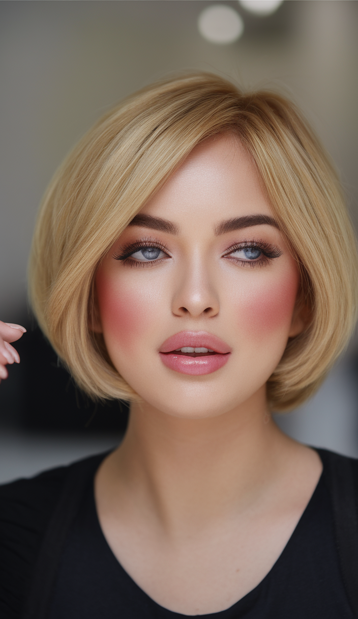 This voluminous blonde bob offers soft, rounded edges and a smooth finish, making it ideal for thin hair or those seeking a fuller look. The subtle layers frame the face beautifully, complementing round faces. A go-to style for spring short haircuts ideas 2025, it’s both classic and modern.
