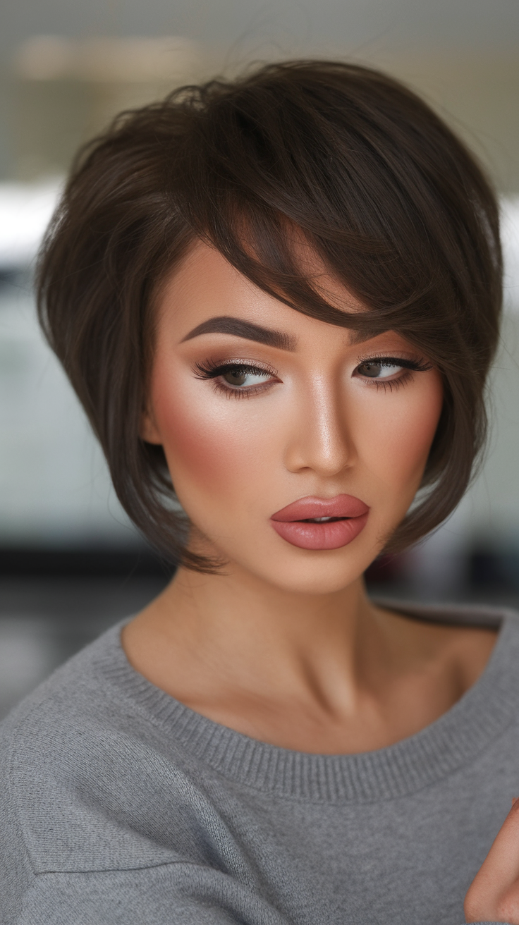 This short brunette hairstyle features soft layers and delicate side bangs, adding a youthful and elegant touch. Ideal for thin hair, it enhances volume and frames the face perfectly, especially for round faces. A great choice for spring short haircuts ideas 2025, this look is both stylish and versatile.