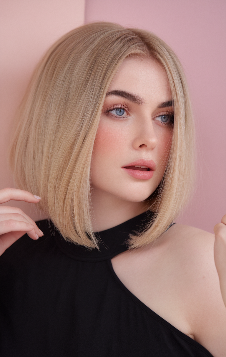 This sleek blonde bob features precise straight bangs, creating a polished and defined appearance. The style works well for thin hair, adding dimension and complementing round face straight hair. A versatile choice for spring short haircuts ideas 2025, it exudes elegance and confidence.