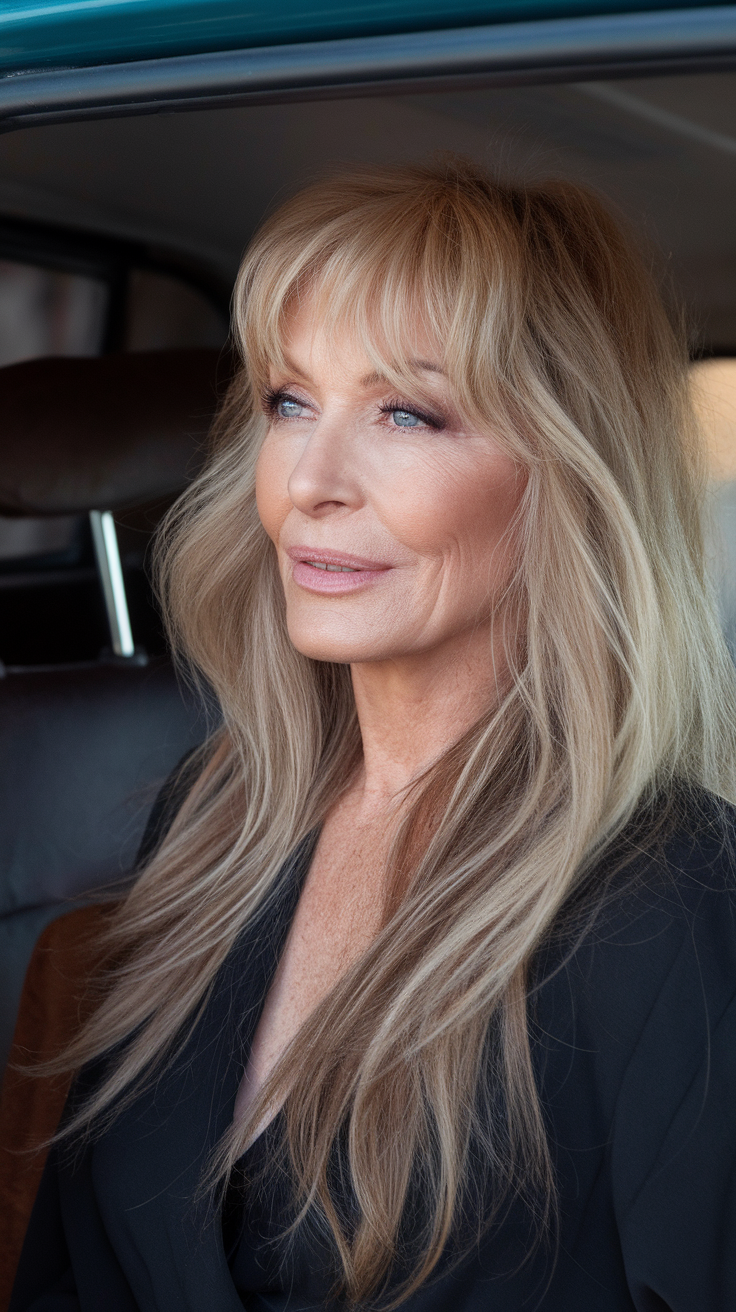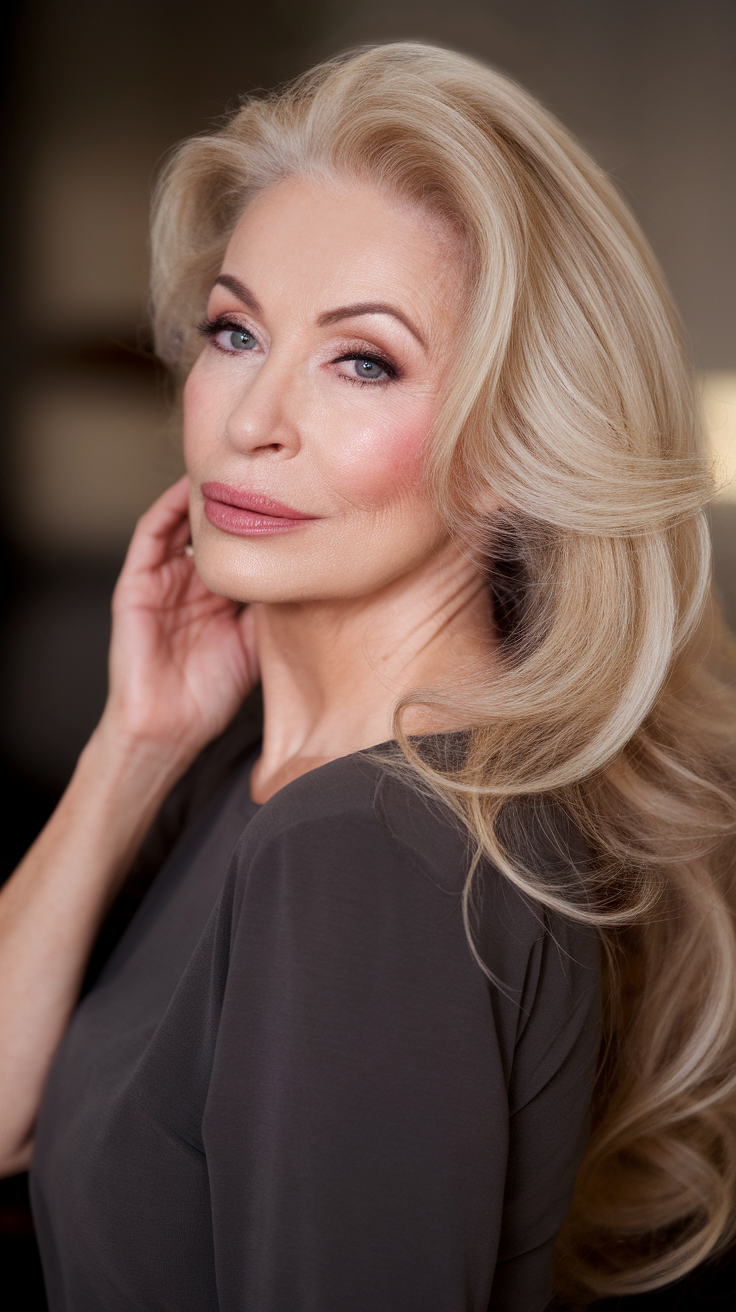 This long hairstyle features voluminous blonde waves with a smooth, glossy finish. The subtle layering adds movement and texture, while the soft golden tones bring warmth and shine. This timeless style is perfect for women over 50 who want a glamorous yet natural look for 2025.