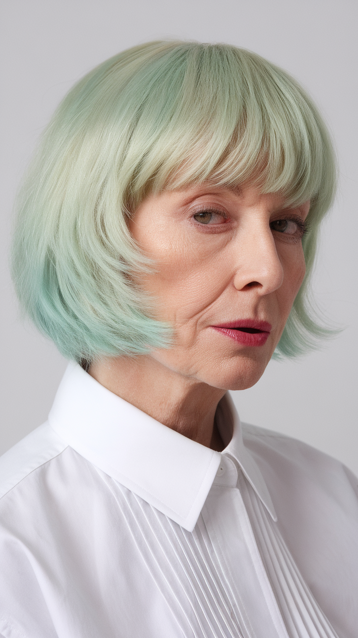 This bold short bob features a fresh mint-green hue, giving it a modern and trendy appeal. The soft bangs add a playful touch, while the smooth texture gives the cut a clean, polished look. This style is perfect for women looking to embrace a unique, fashionable statement while keeping the hair medium short and easy to maintain.