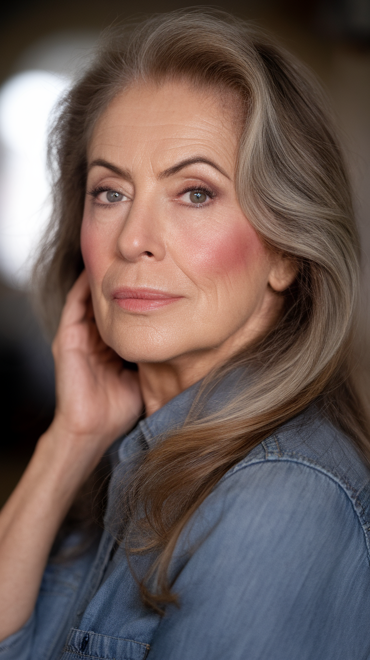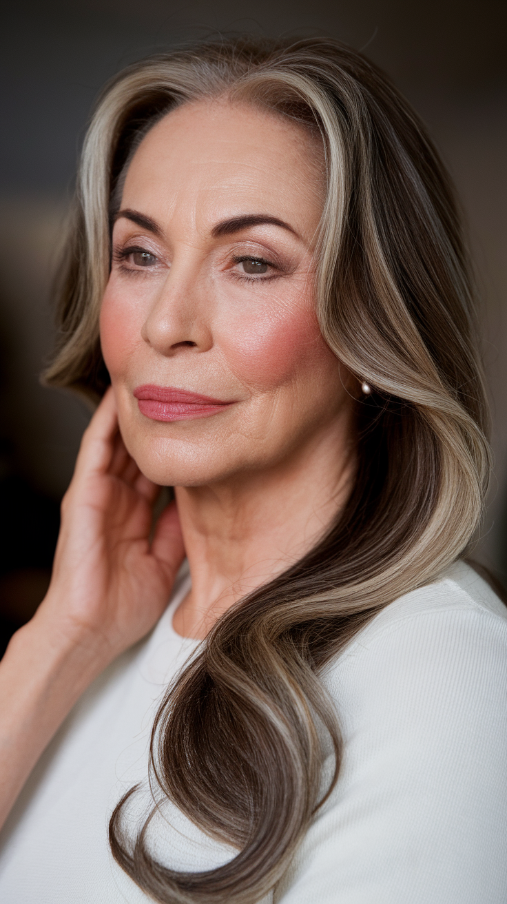 This long hairstyle showcases smooth, voluminous waves with subtle, face-framing highlights. The natural flow of the hair creates an elegant and timeless look, with the soft highlights adding dimension and depth. This style is perfect for women over 50 seeking a sophisticated yet modern haircut with minimal effort.