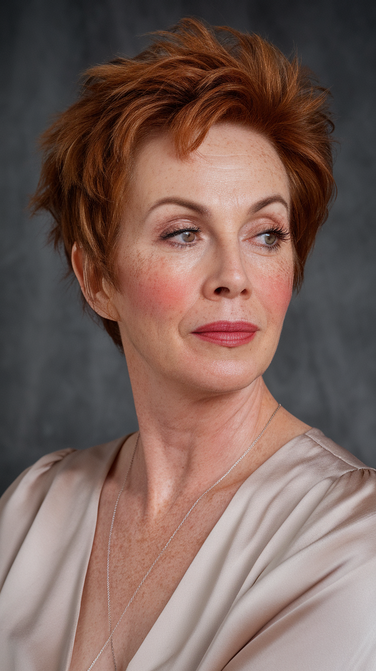 This bold short pixie cut features rich copper tones, giving the hairstyle vibrancy and character. The slightly spiky layers on top add movement and texture, while the tapered sides create a clean, polished look. This sassy and modern haircut is ideal for women over 50 looking for an easy-to-maintain yet statement-making style.