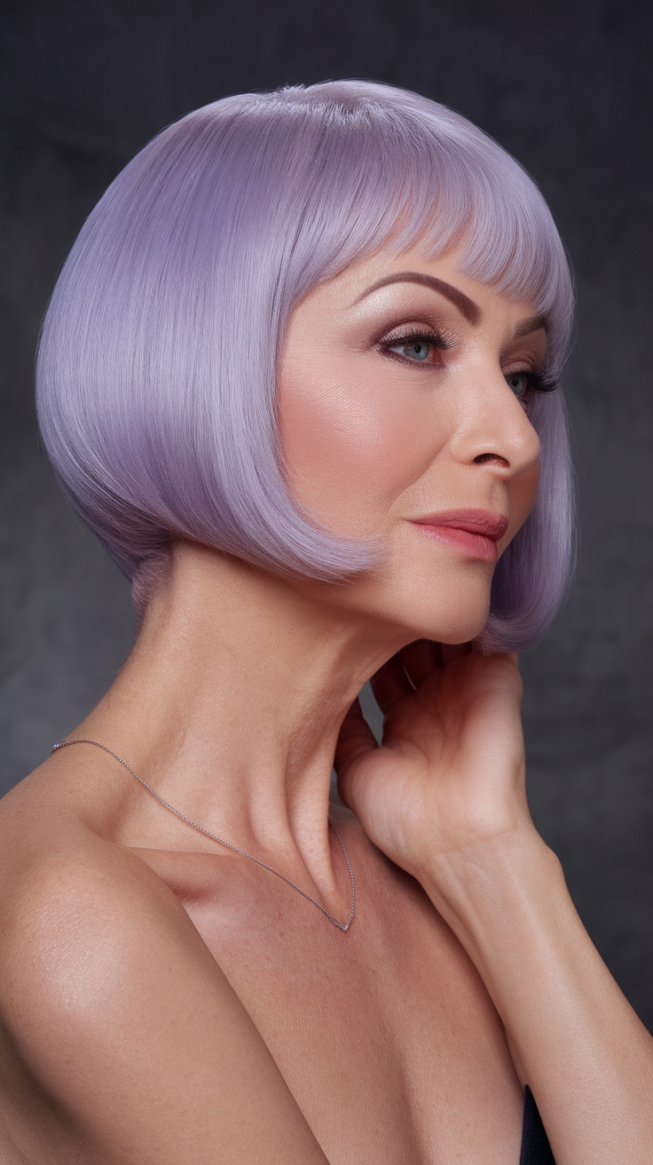 This sleek short bob stands out with its soft lavender hue, offering a bold yet sophisticated look. The straight texture with rounded ends gives the style structure and a polished finish. Paired with delicate bangs, this cut is ideal for women over 50 looking for a unique, trendy, and short stylish haircut.