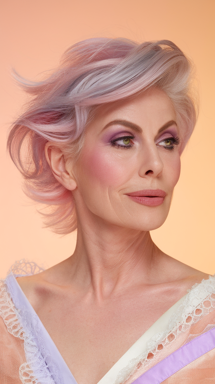 This short stylish cut combines a soft pastel pink shade with airy, tousled layers. The shag styling adds texture and volume, creating an effortlessly playful yet polished look. The light pink hue gives this haircut a fresh, modern twist, making it perfect for women over 50 who want a chic and unique style.