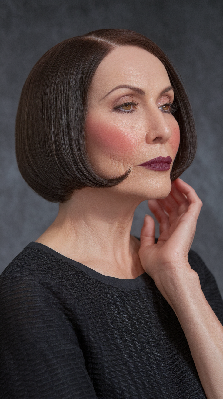 This short bob features sleek lines paired with soft, wispy bangs that add a modern yet classic touch. The subtle highlights around the face provide depth and dimension, enhancing the haircut’s chic silhouette. Perfect for women over 50, this look is both versatile and effortlessly stylish for 2025.