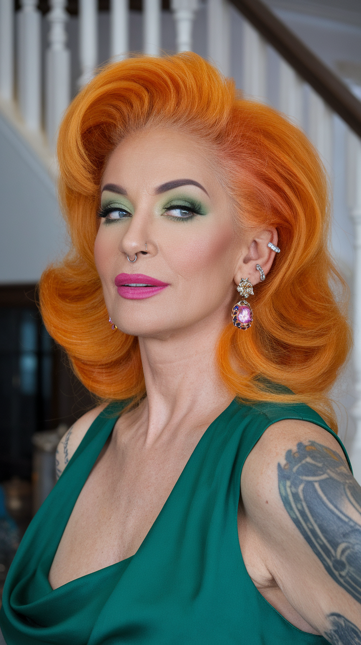 This shoulder-length hairstyle features voluminous, sculpted waves in a vibrant orange shade. The bold color makes a statement, while the structured waves add vintage charm and modern energy. This cut is ideal for women looking for a sassy and trendy style that combines personality with sophistication.
