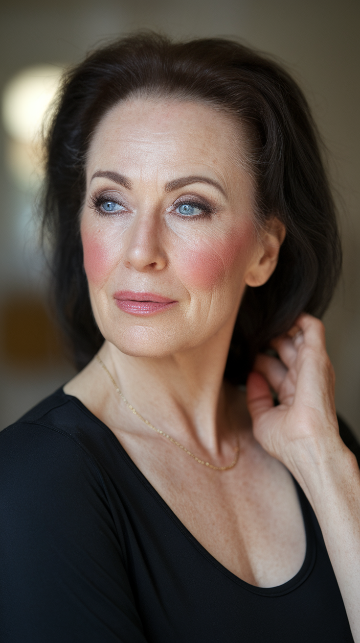 This hairstyle showcases medium length hair with soft, blended bangs that sweep gracefully across the forehead. The long locks flow in smooth waves, giving the style an elegant and refined finish. The warm brunette tones add richness and enhance the natural shine of the hair. This look is ideal for women over 50 seeking a flattering and modern haircut for 2025.