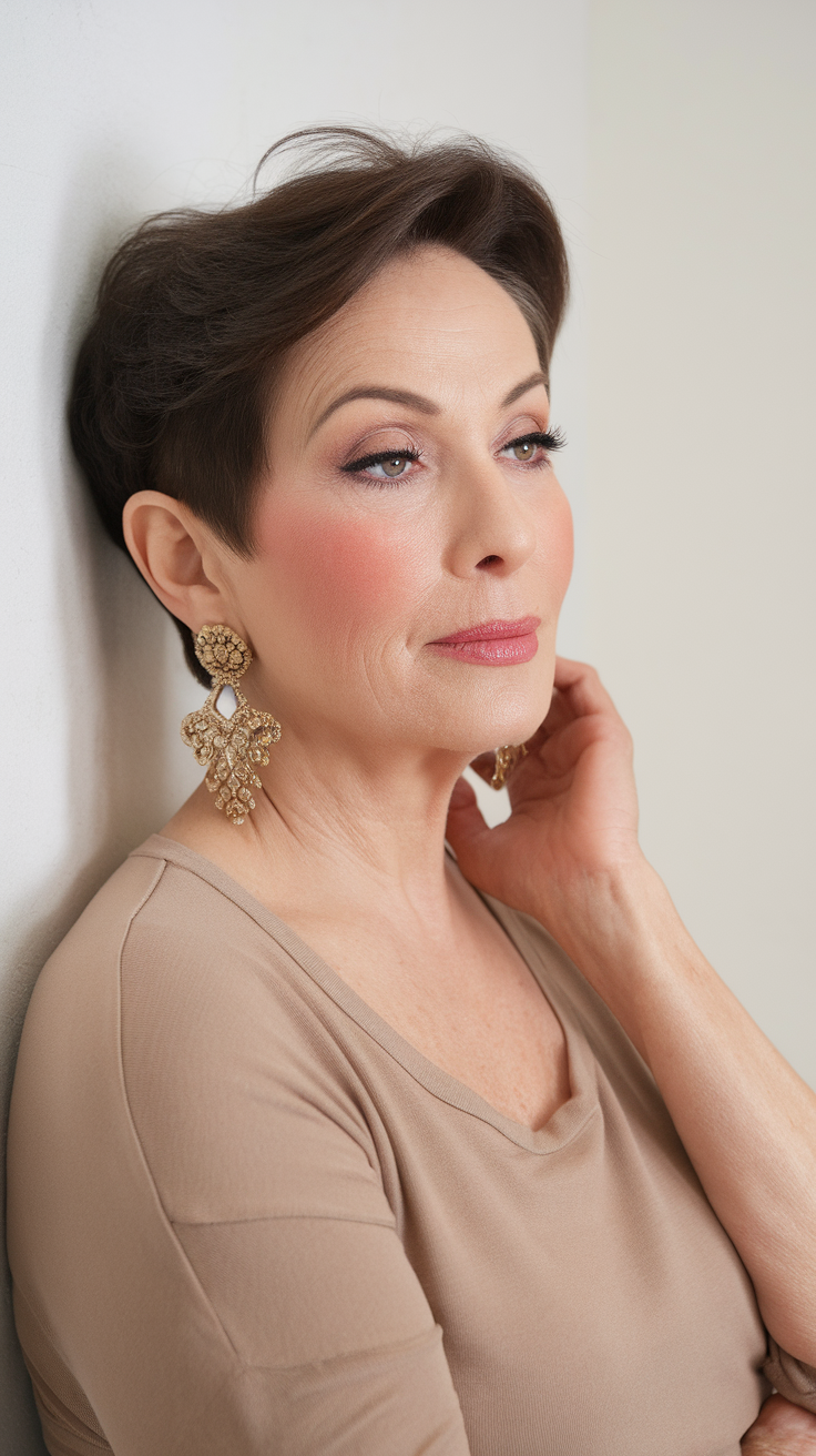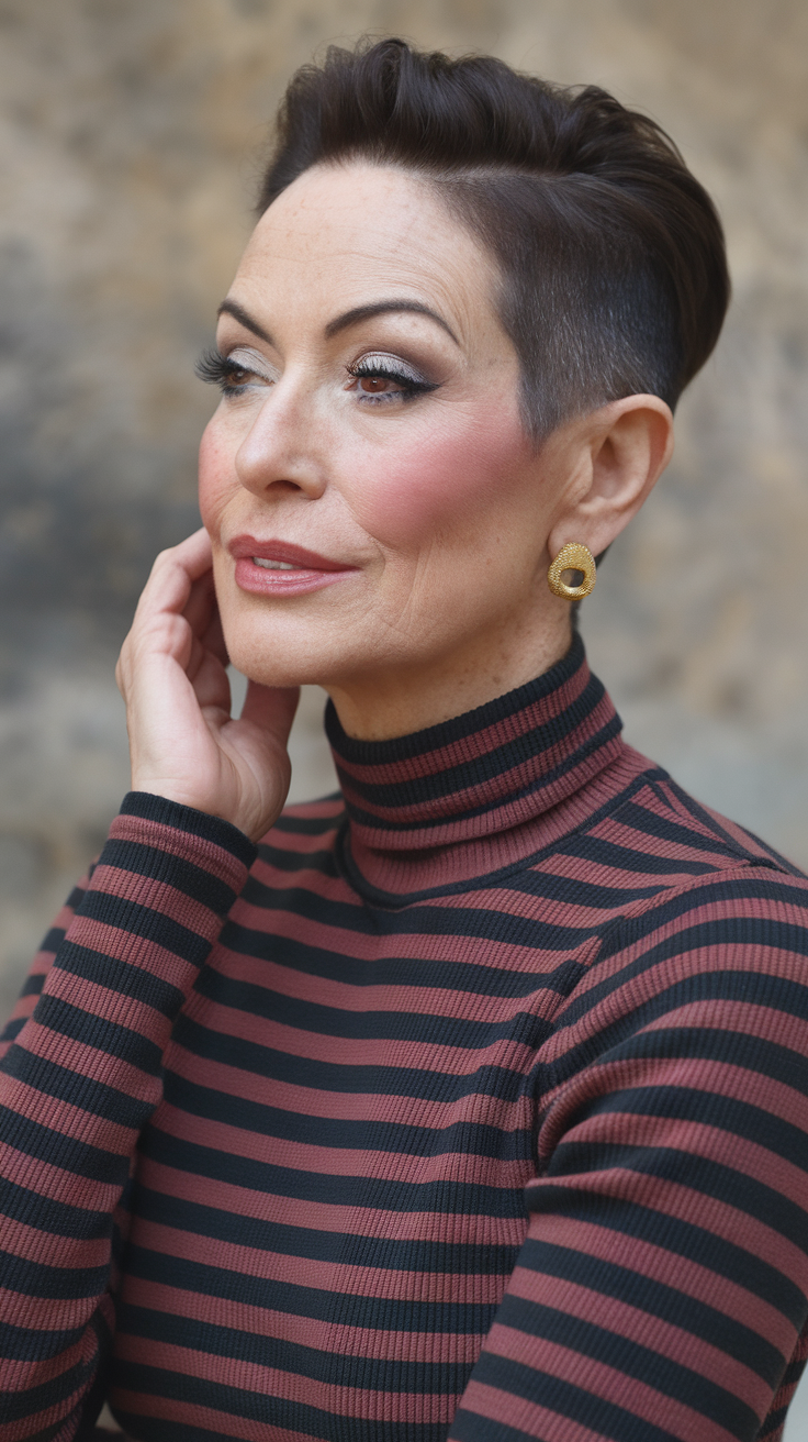 This bold short spiky hairstyle features an edgy undercut, adding a modern and daring look to the hair. The longer top creates texture and volume, while the clean sides emphasize the sharp lines of the cut. The dark hair color enhances the boldness of this style, making it perfect for women over 50 who want a sassy and trendy haircut for 2025.