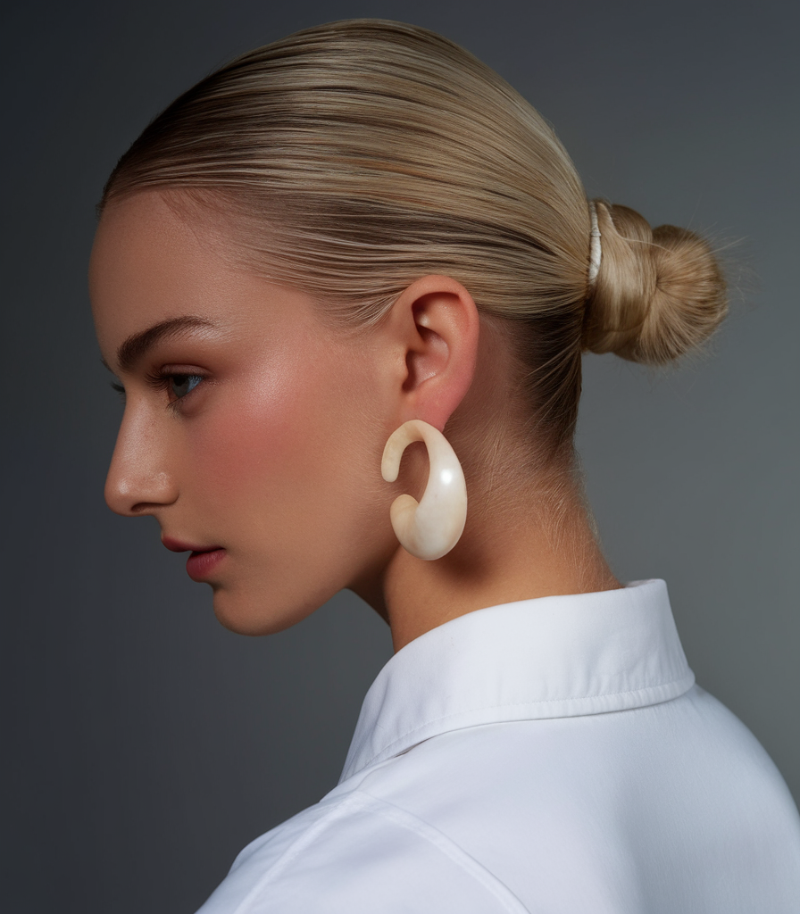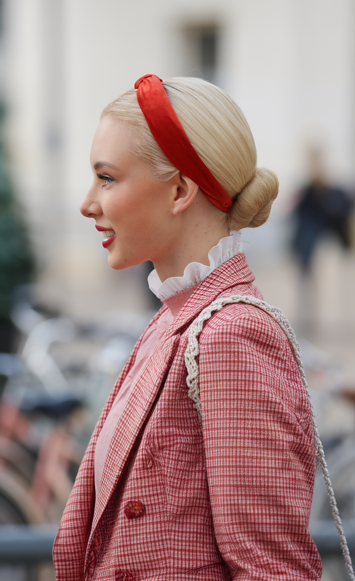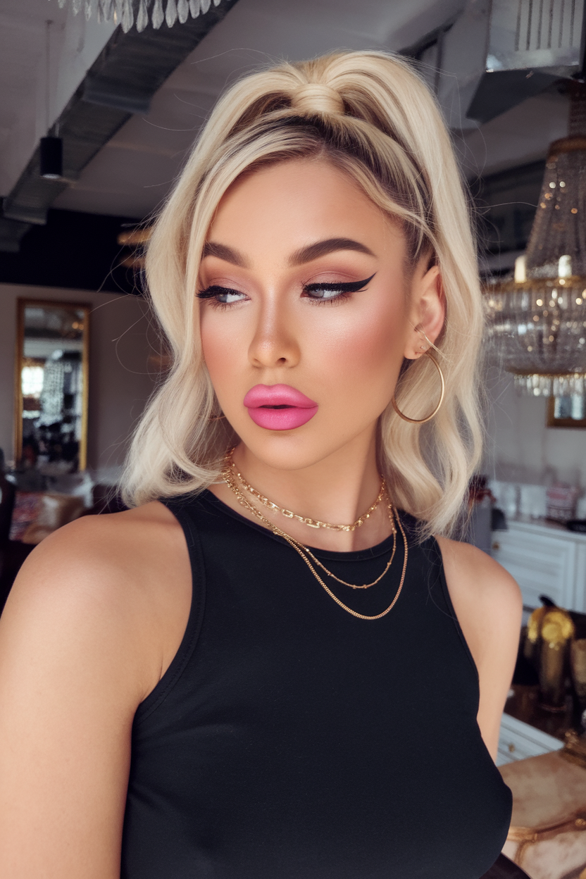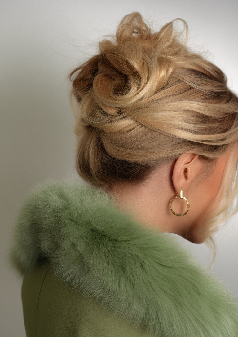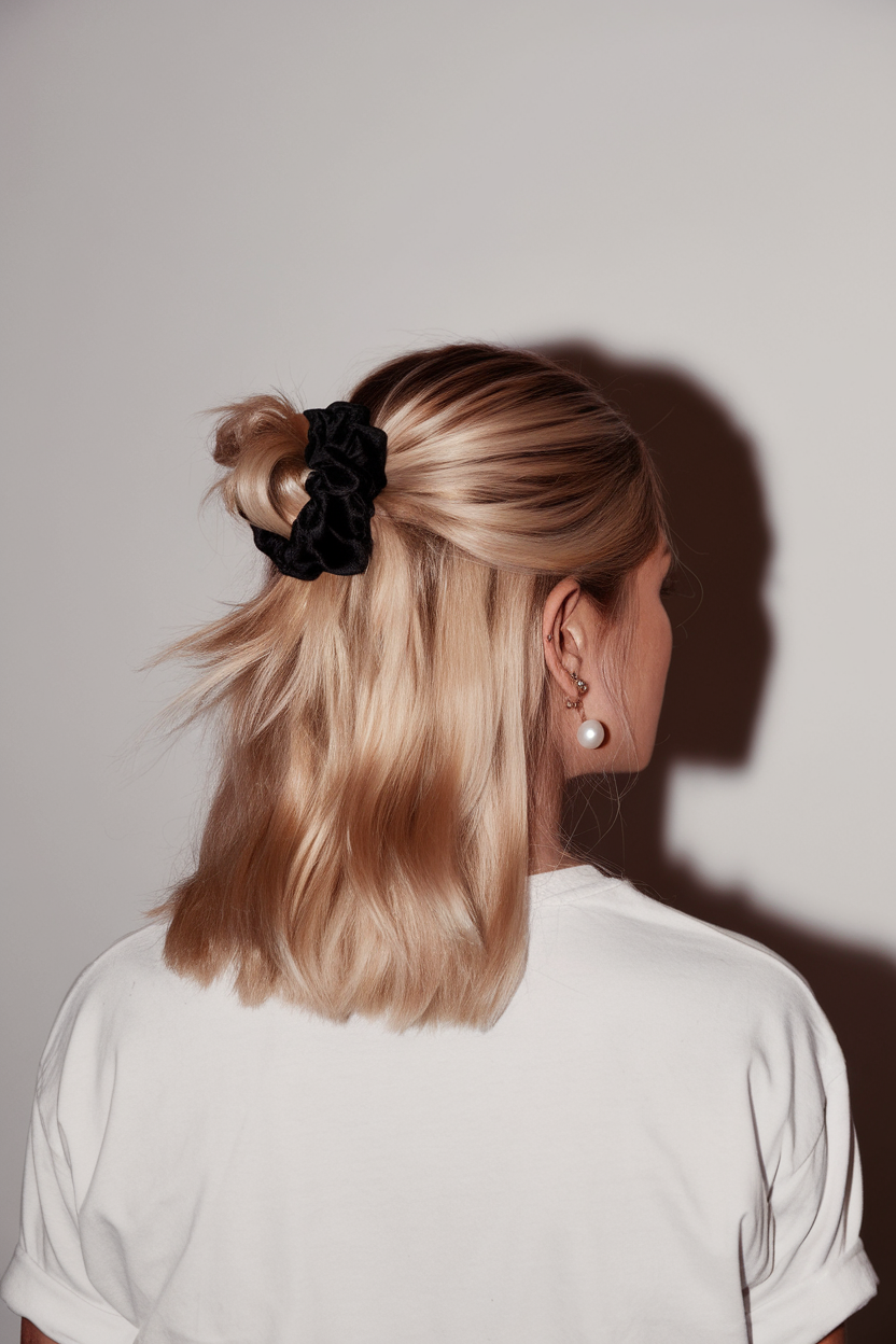 The shoulder-length blonde hair is styled in a relaxed half-up knot, secured with a black scrunchie for a casual yet chic aesthetic. Soft waves create a lived-in texture, enhancing the hair’s natural dimension. This effortless style works beautifully for medium-length hair with subtle layers.