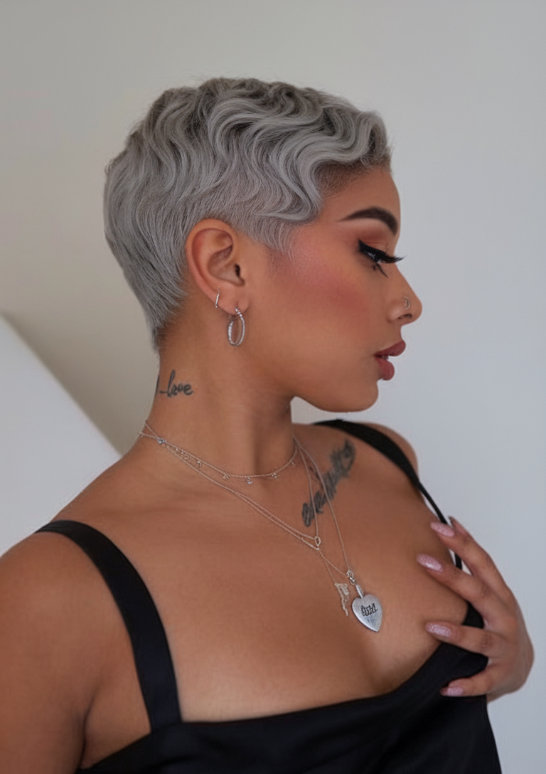 This edgy women black woman pixie cut features sleek curly finger waves for a vintage touch. The cool-toned silver shade enhances the sculpted texture, making it classy yet bold. Perfect for women over 60 or those looking for a modern twist on a timeless style.