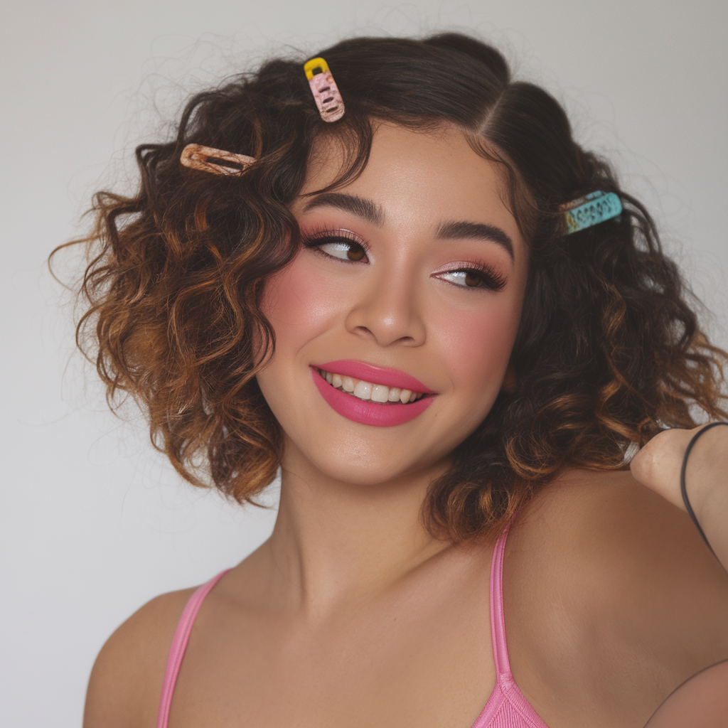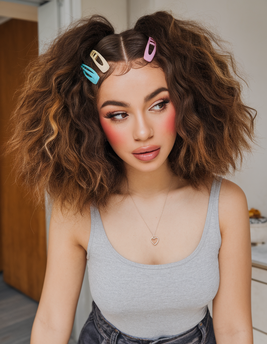 This voluminous curly bob blends natural dark roots with warm caramel highlights, adding depth and movement. The soft curls are effortlessly styled and pinned with colorful clips for a fun, retro-inspired touch. This look brings a youthful, carefree vibe to short, textured hair.