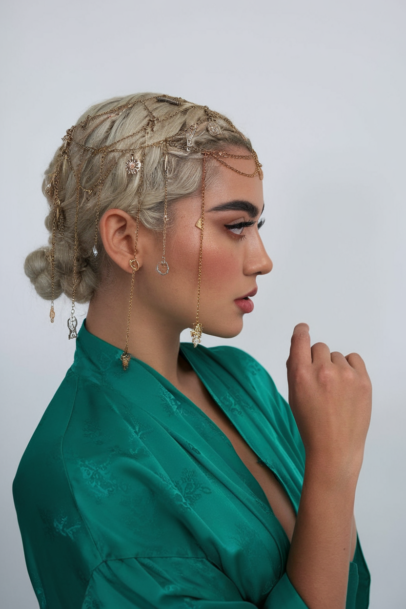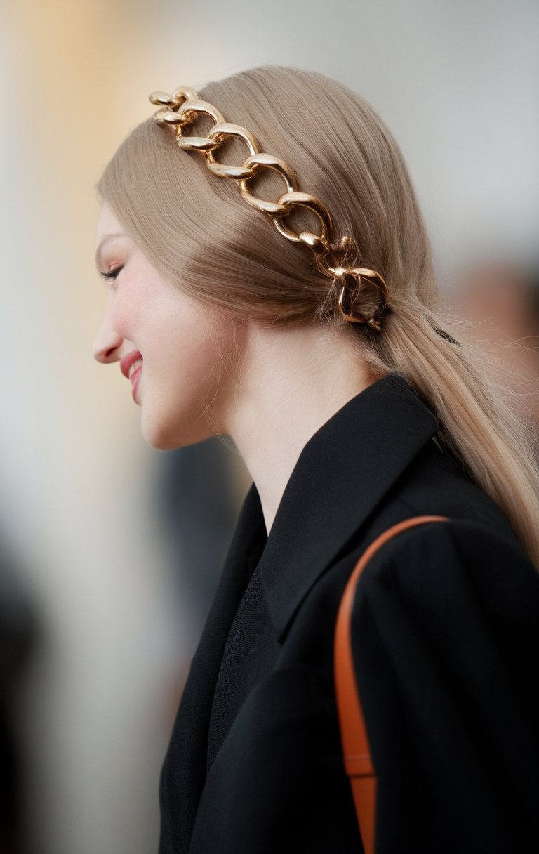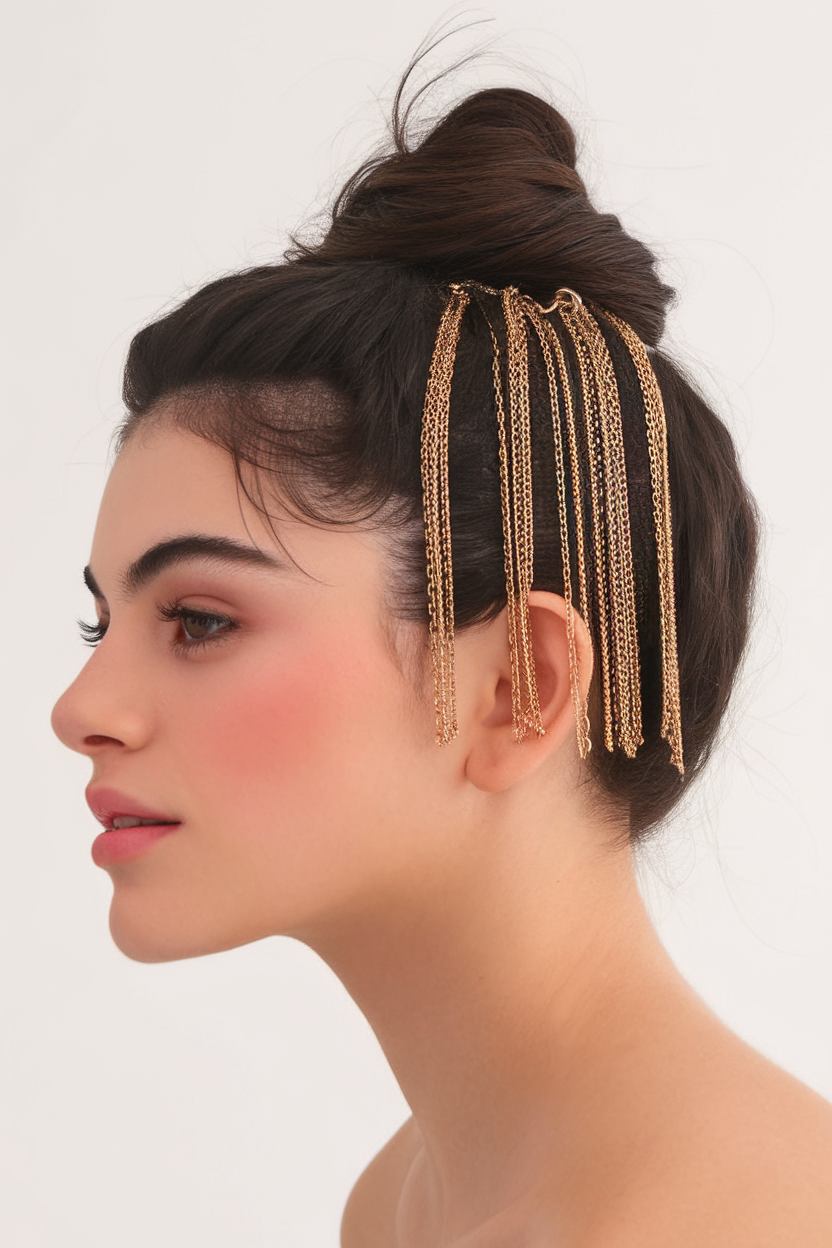 This women straight hair updo combines a sleek bun with cascading gold chains for a statement look. The contrast between the polished finish and edgy accessories makes it a bold choice for women ideas for wedding or formal events. A perfect fusion of classy and modern style.