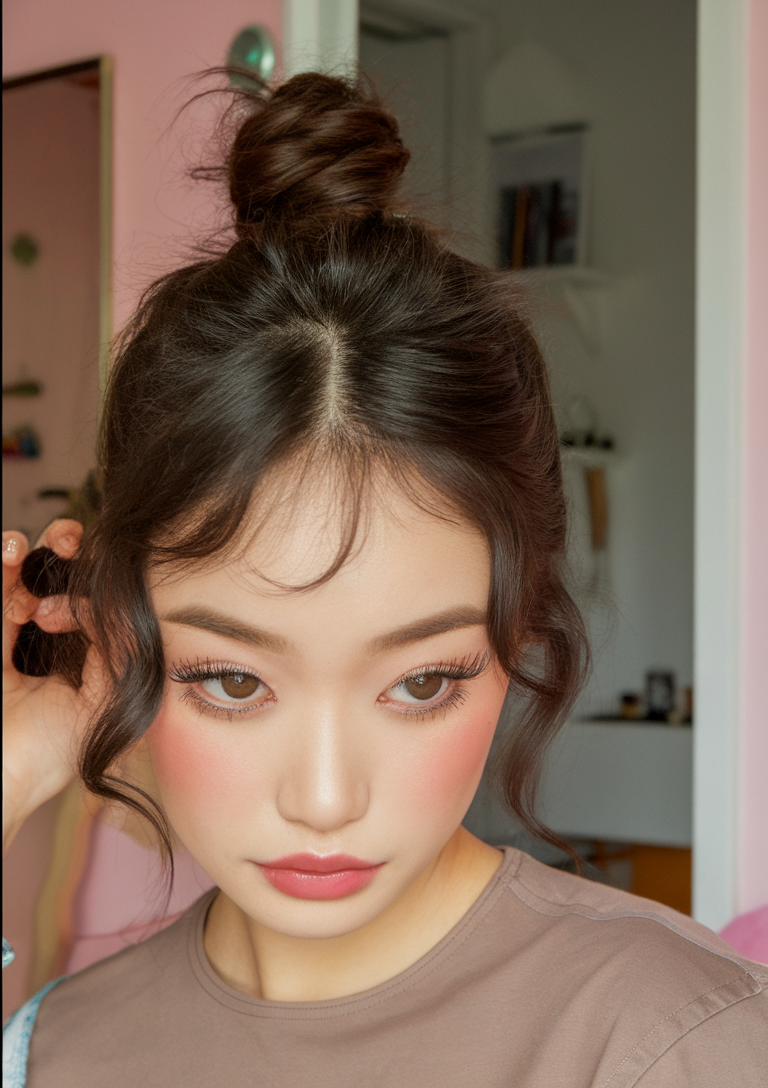 This Korean-inspired bun features curtain bangs and delicate tendrils for an effortless, romantic feel. The wavy strands add movement, making it a flattering choice for women round face shapes. A go-to style for women ideas school or casual elegance.