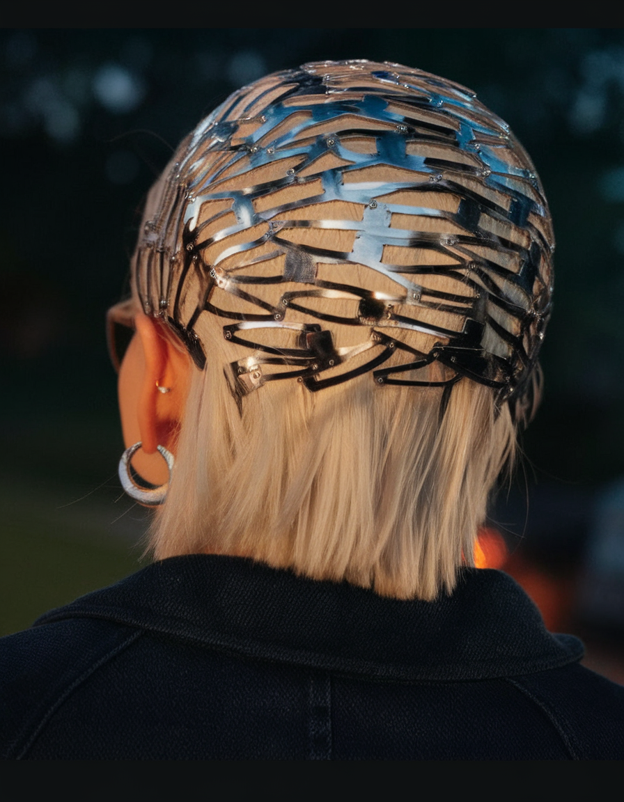 This edgy women straight hair style features a sharp bob adorned with layered metallic clips. The structured placement creates a futuristic effect, perfect for women ideas for wedding or high-fashion events. A modern twist on minimalistic styling with an avant-garde touch.