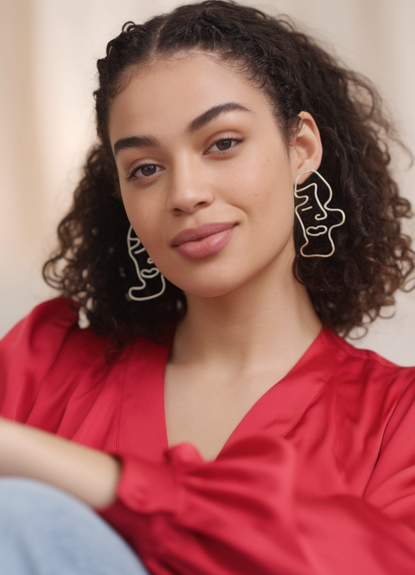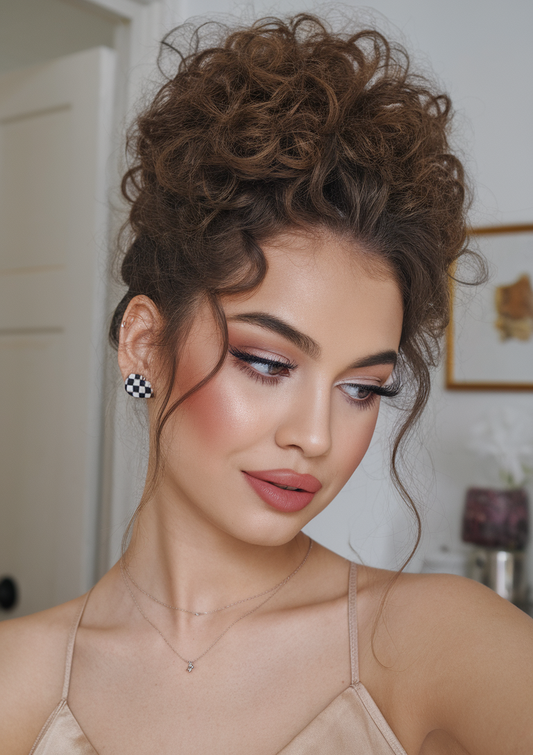 This voluminous curly updo is perfect for women ideas for wedding or formal events. The lifted crown enhances natural thick hair, while the soft tendrils frame the face beautifully. It’s an effortlessly classy look that flatters women round face shapes.