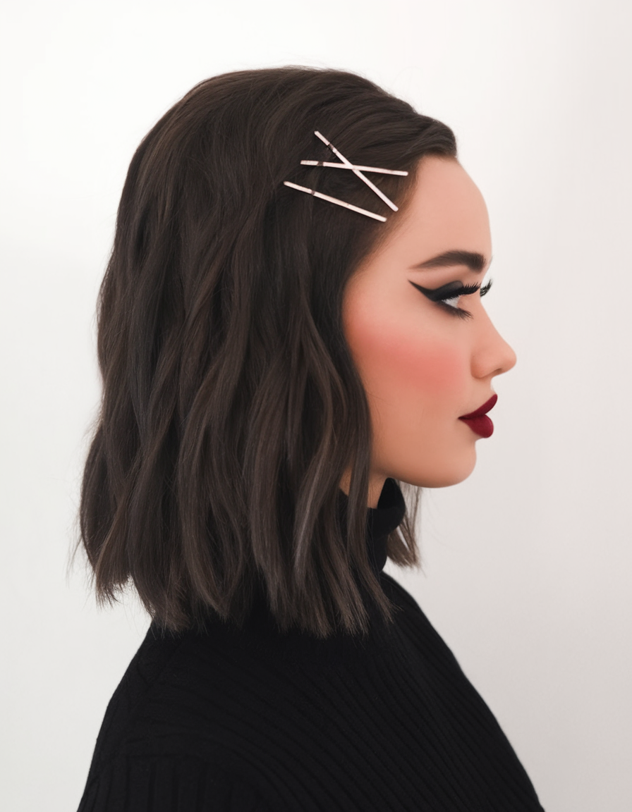 This wavy bob is a fresh take on women straight hair, styled with sharp bobby pins for a structured finish. The soft layers add movement, making it perfect for women round face shapes. A versatile and classy style that blends sophistication with edge.