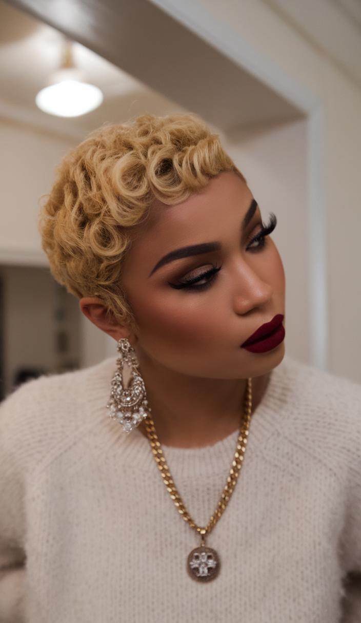 This women black woman pixie cut brings back the elegance of vintage curly finger waves. The golden blonde shade adds warmth, making it an excellent choice for women over 60 who love timeless styles. A bold yet refined look that’s both nostalgic and trendy.