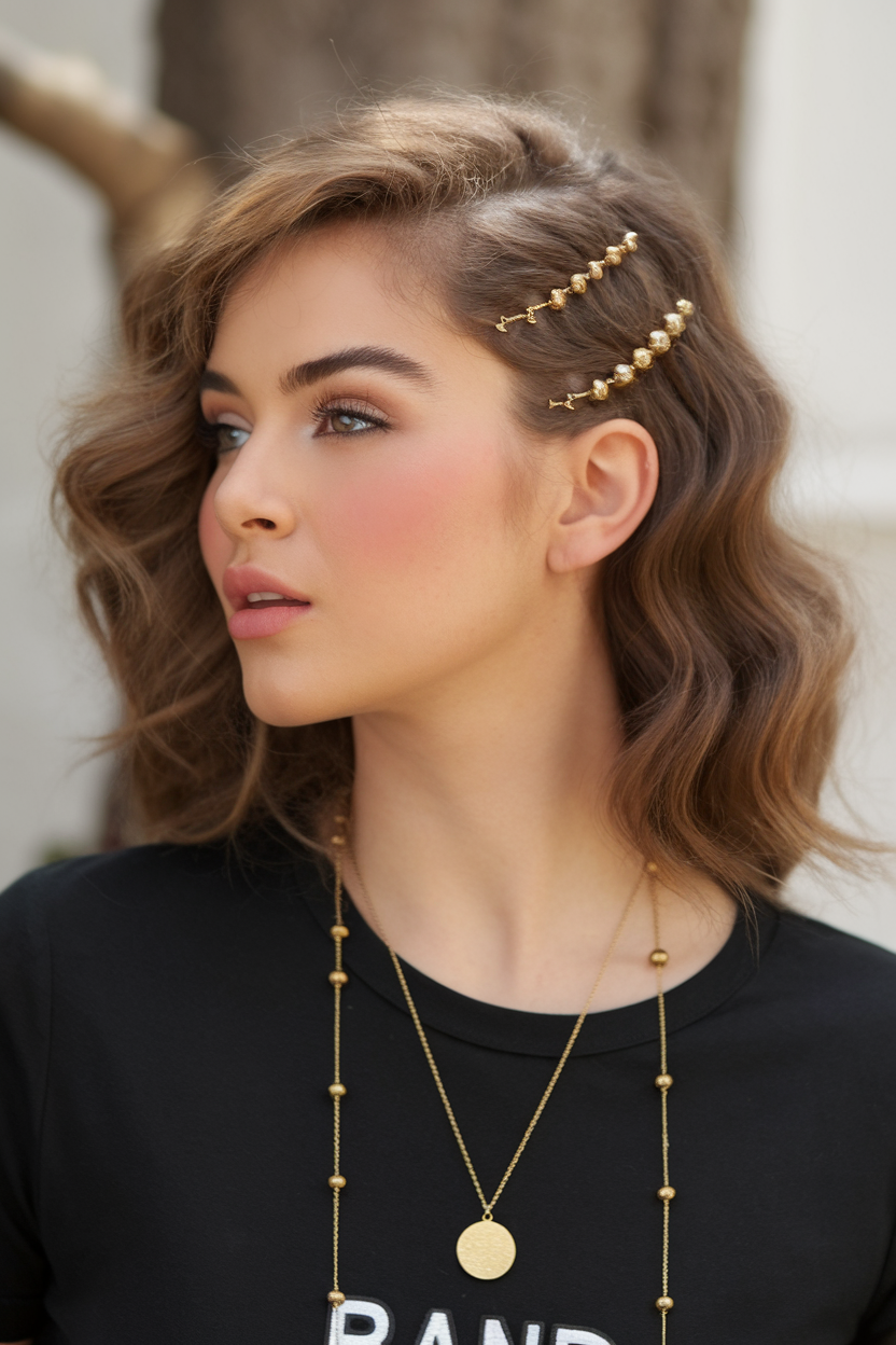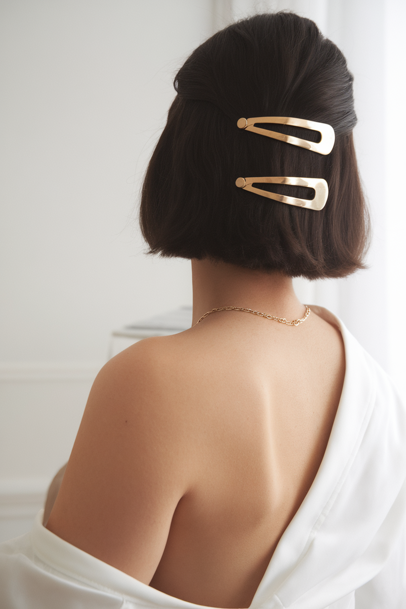 A smooth, chin-length bob in a deep, rich brunette shade is elevated with oversized gold hair clips. The half-up styling keeps it sleek and polished while maintaining volume and structure. This minimal yet refined hairstyle is perfect for a modern and sophisticated look.