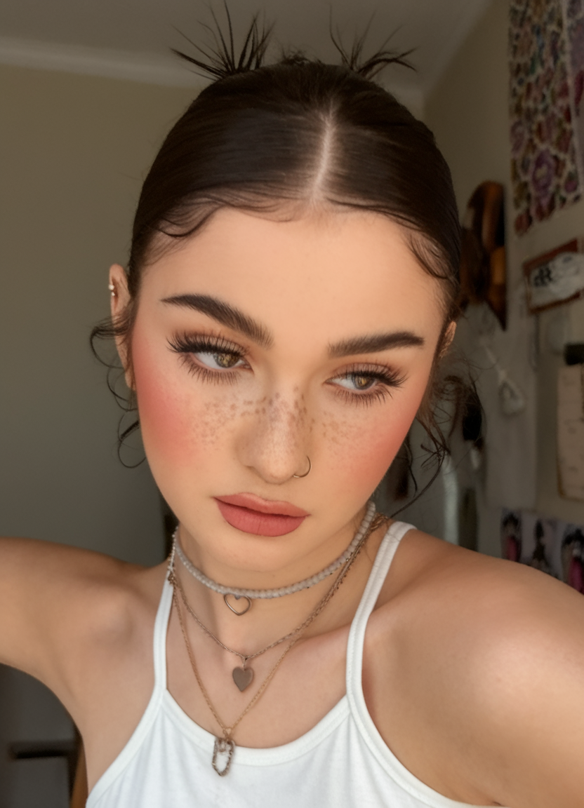 This Y2K-inspired hairstyle features sleek, straight hair with playful mini space buns. The loose strands add a cute touch, making it perfect for women ideas school or casual outings. It’s an effortless yet stylish look that complements women round face shapes beautifully.