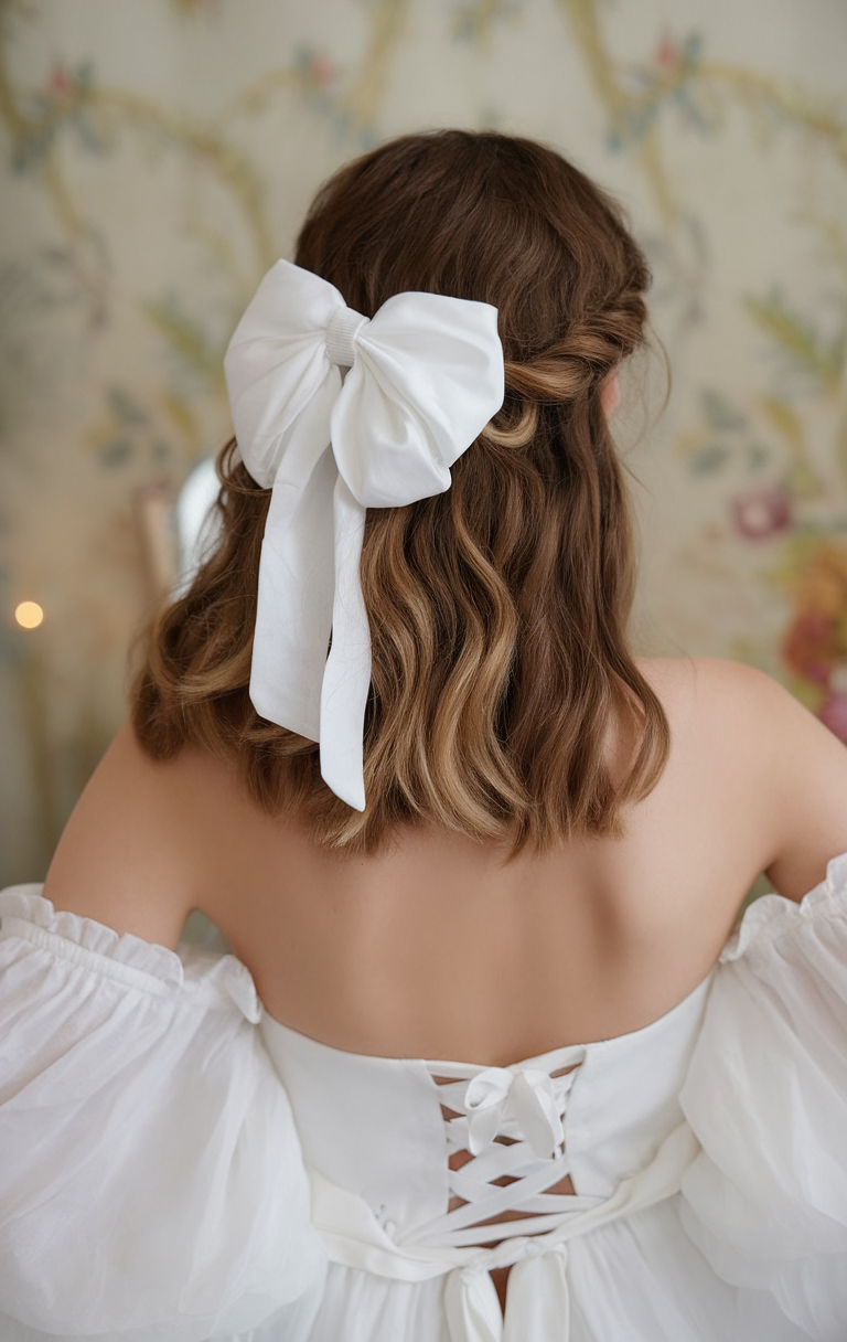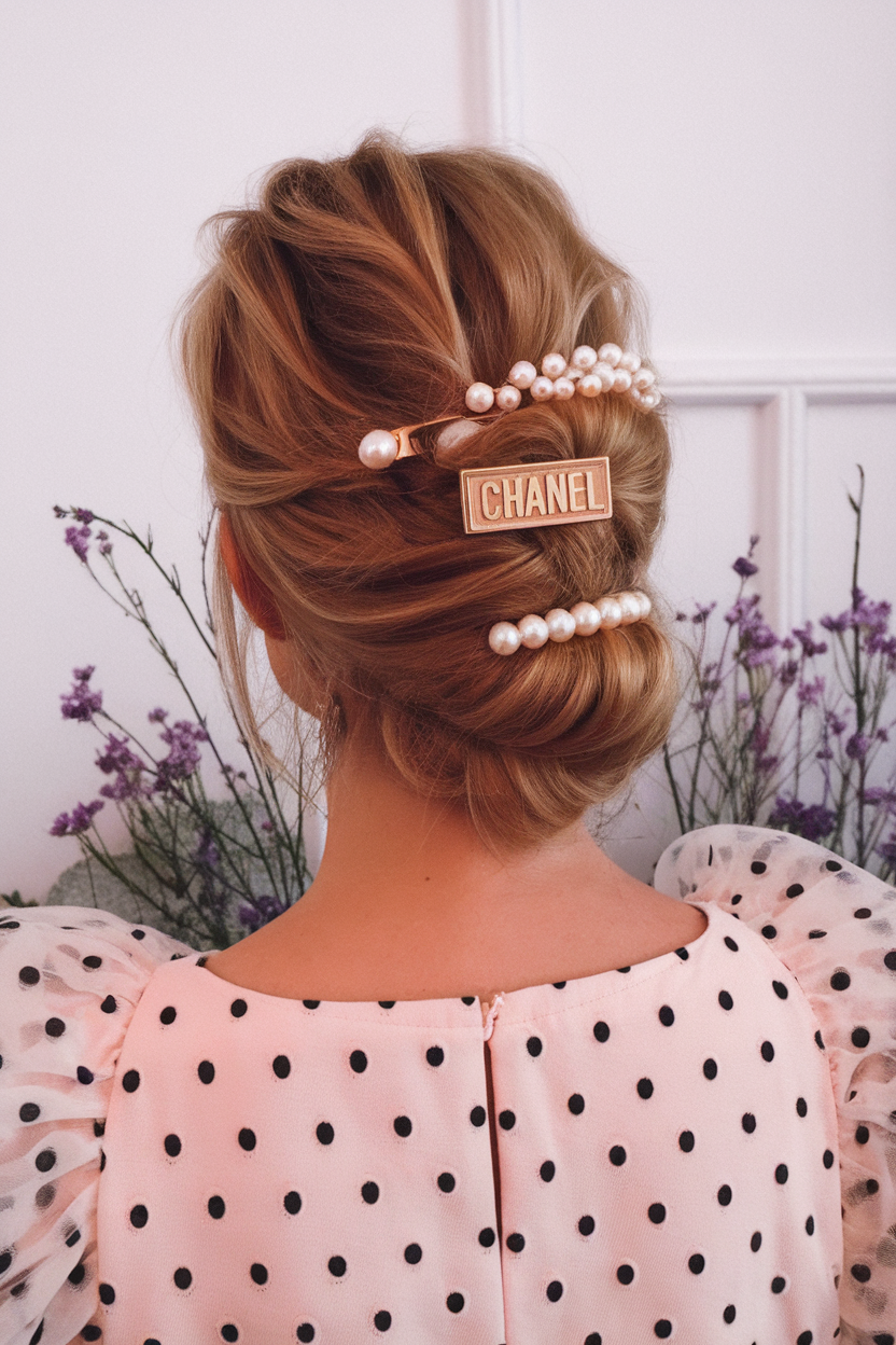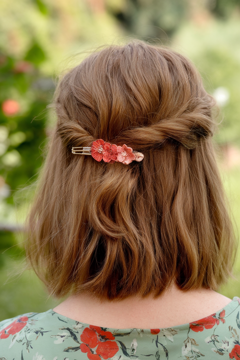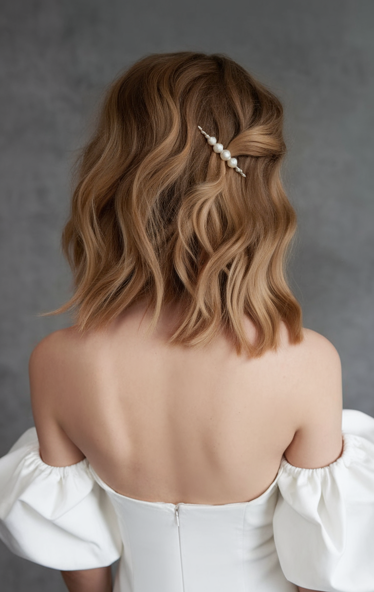 The medium-length bob receives a twisted half-updo which generates gentle volume on the top section. The wavy and textured ends remain loose to create an easygoing appearance with a naturally refined touch. The floral clip functions as an attractive decorative detail which brings charm to the classic cut so it becomes suitable for both garden celebrations and everyday summer outings. The style works marvelously for individuals who have fine hair because it provides definition.