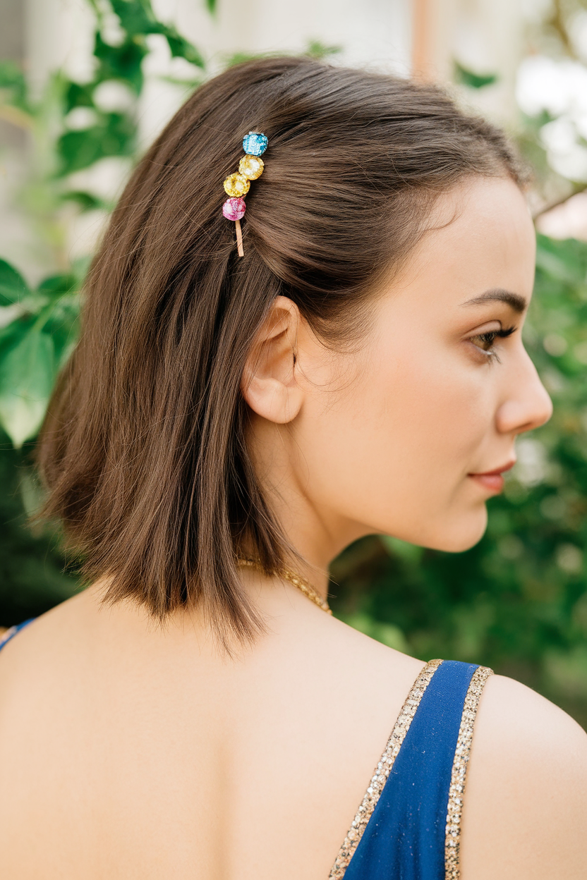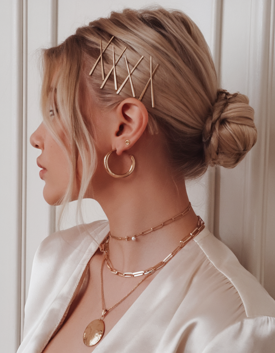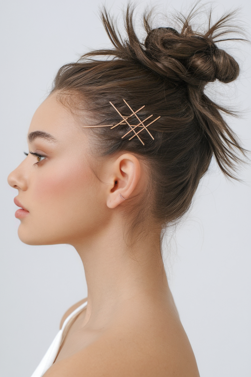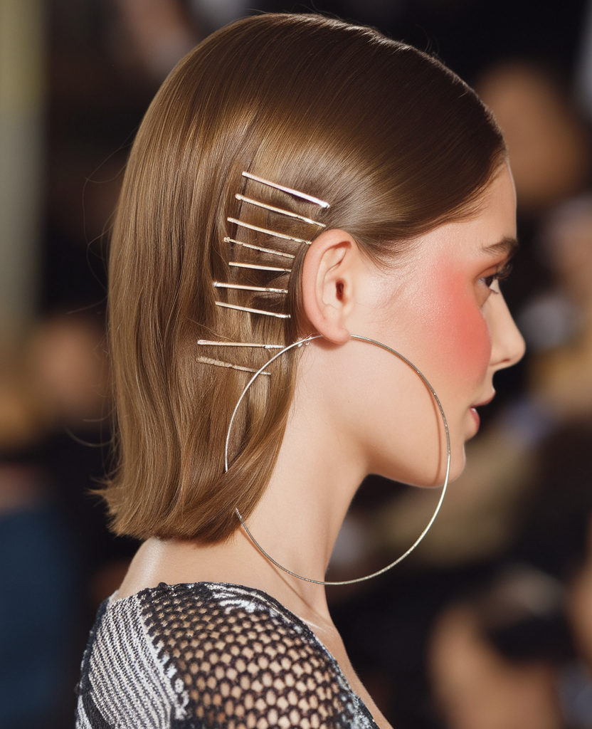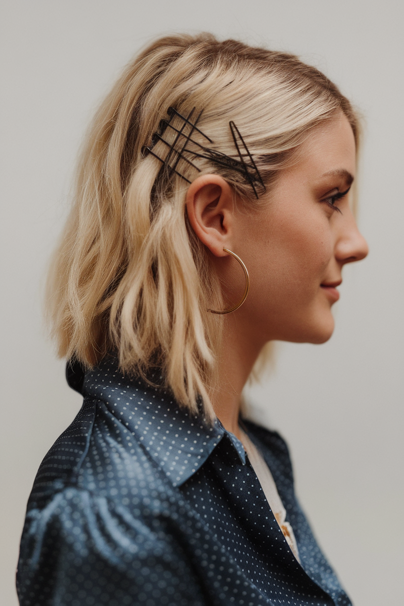 A short asymmetrical haircut presents soft disordered ends which naturally enhance the way hair moves. Light blonde hair highlights the warm climate feel so it becomes perfect for fashioning hot weather styles. Structure along with fresh appeal emerge from the crisscrossed black pins which unite contemporary design with everyday casualness on one side. This hairstyle presents a powerful option to adopt short hair fashion in 2025 while needing little maintenance.