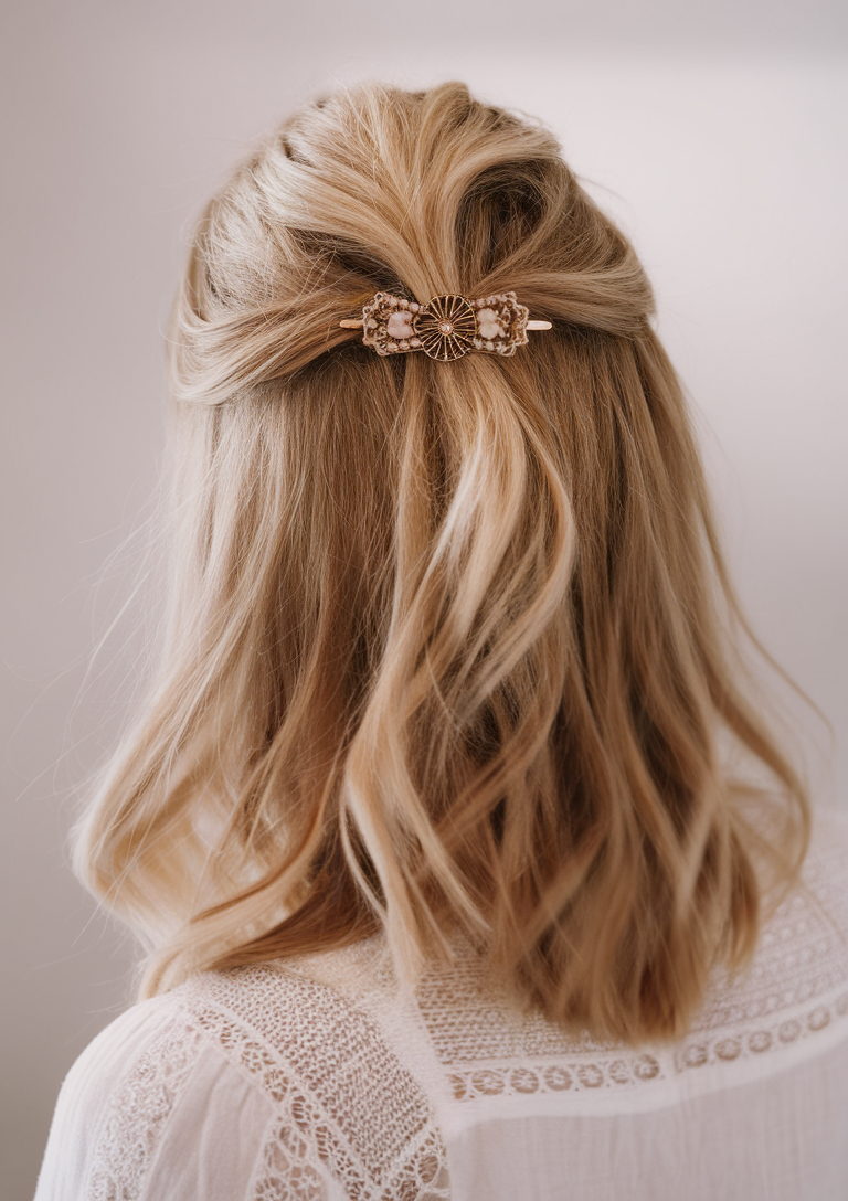 A layered bob presents itself as a relaxed half-up style that features softly waving ends which fall at shoulder length. The central decorative clip draws attention to the crown as the gentle bends throughout the style add lift to the hair. The particular haircut suits fine hair types because it provides volume without requiring heat-based styling tools. This hairstyle offers closure between traditional and everyday casual styles which makes it appropriate for typical wear.