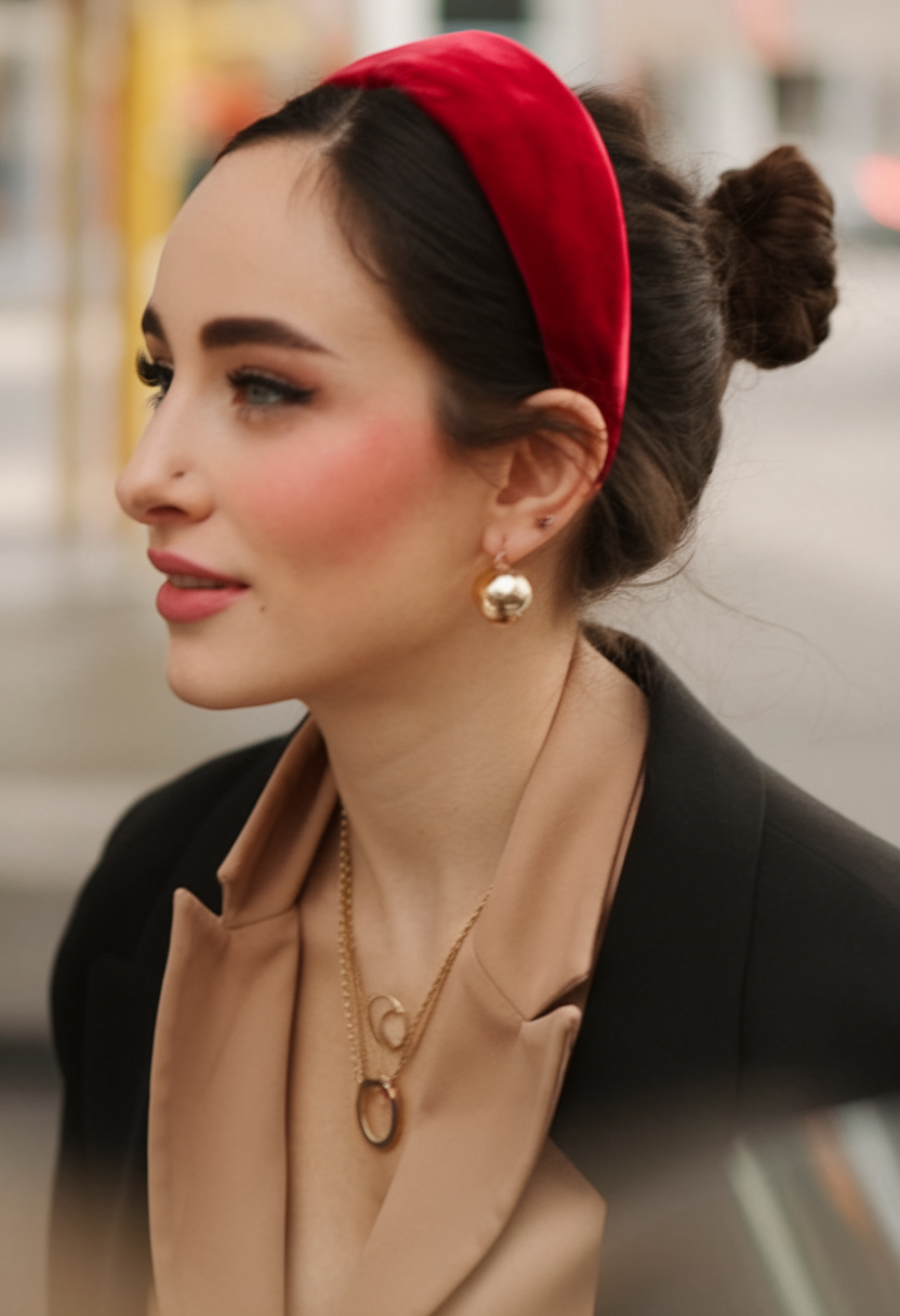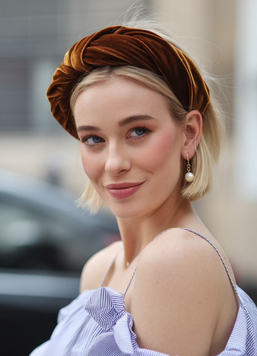 The short bob receives a tidy updo treatment that features a chunky red velvet headband providing an eye-catching accessory. The retrospective arrangement of dark brown hair contains a neat smoothing stroke to produce a well-organized and sophisticated appearance. The styling technique brings together vintage appeal with modern stylishness in perfect harmony. The simple version serves as an attractive style enhancement for future 2025 short hair patterns without requiring complicated changes to the cut.