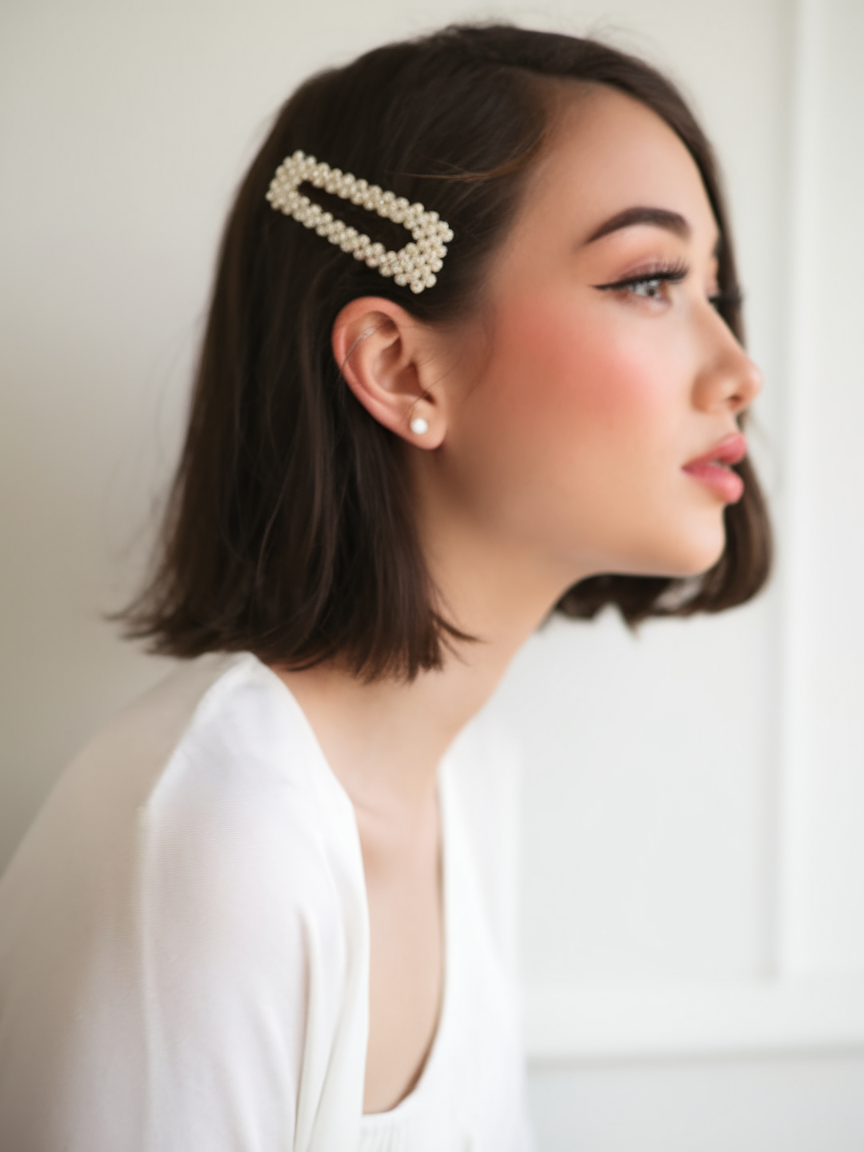 A medium-length bob distinguishes itself through its traditional straight lines and simple yet glamorous appearance. A modest pearl-encrusted clip finishes the style after the hair is neatly positioned behind the ear. People with thin hair can achieve a well-defined shape from this hairstyle because it lacks excessive volume. This hairstyle stands as an excellent option for business casual looks with its sophisticated charm.