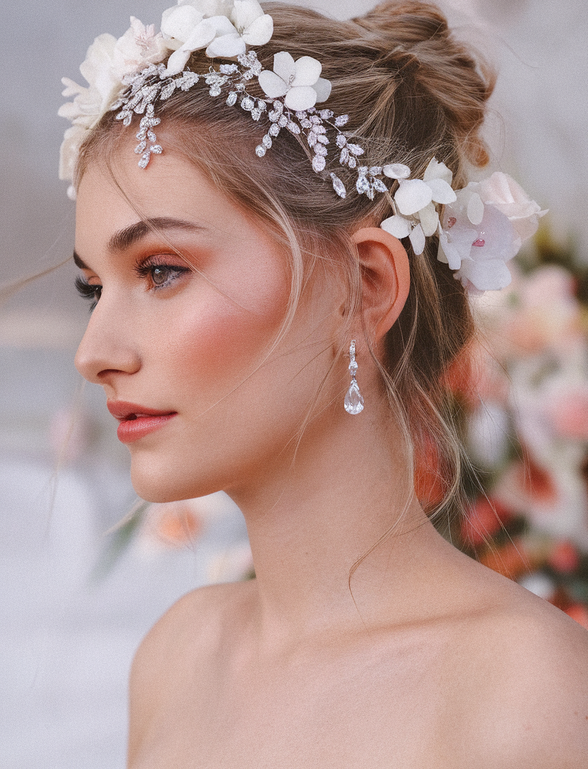 A medium-length bob style receives a soft updo formation that leaves some drifting hair pieces to frame the face. Its dreamy appearance emerges from the light golden color combined with its airy texture. The floral accessory complements this style so it works well for weddings or special ceremonies. The elevated version in summer bob hairstyles combines delicate charm with whimsical elements.