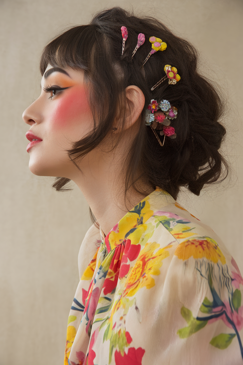 This short bob style gets an elevated look through its structured frontal bangs and vibrant floral clips that define its sections. The style unites modern vintage appeal through whimsical placement that emphasizes the angled elements of the haircut. Short curly or wavy hair textures maintain their shape and volume to make this style idea effective. This daring haircut stands out as an ideal choice for people interested in stylish artistic choices for their short hair in 2025.
