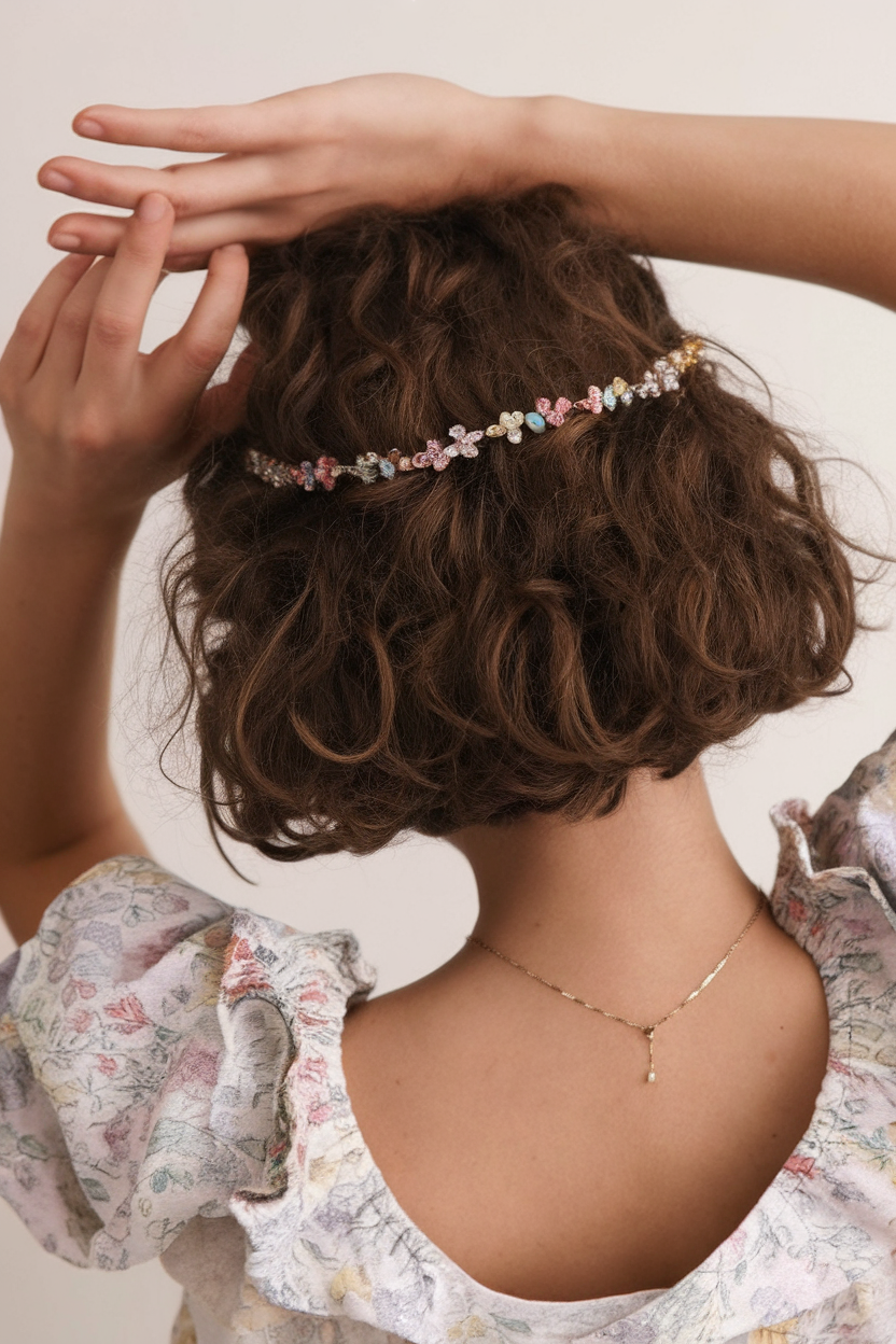 This short curly bob displays tight natural curls which have been neatly rounded into a smooth shape. A dainty floral hair accessory completes the look by adding tenderness to the texture for a magical appearance. This style delivers voluminous shape and manages to work effectively for either fine hair or those with thick hair borders who want to achieve guided definition. This style serves as a simple summer approach to relaxed hair fashion.