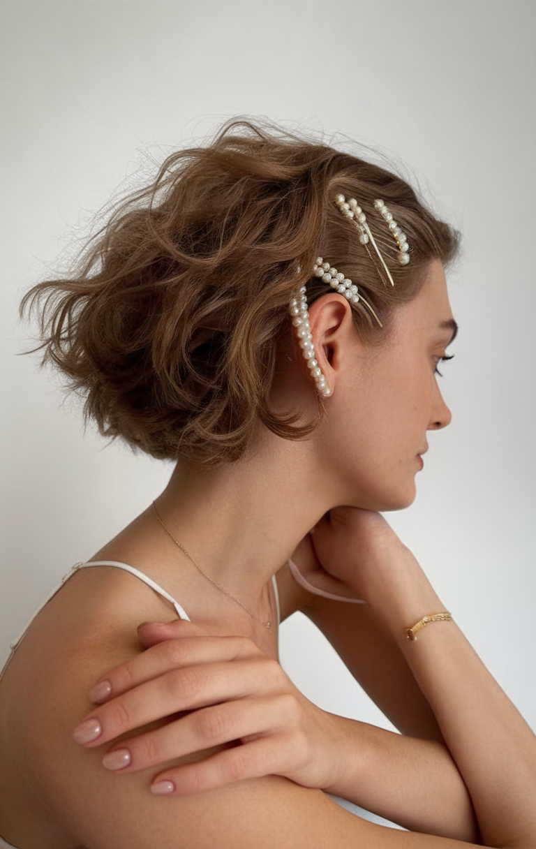 The short choppy bob displays shaggy disordered layers which generate an untamed yet naturally occurring finish. The loose brown color along with its native waves enhances the impact of the layered style through casual body movements. Pearl pins add volume to the hairstyle and use both structure and style to frame the face. People who prefer contemporary sophistication coupled with delicate fashion in upcoming short hair trends of 2025 should consider this style.