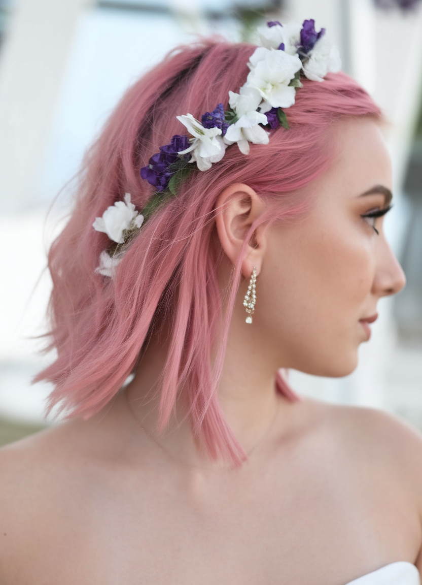 A brief choppy bobृत makes an impression through its bright pink color and light-textured finishing. The collarbone level cut features a pointed shape which enables the hair to gracefully sweep through changes in motion. The floral crown elevates the light and disheveled elements of this summertime suitable hairstyle by accentuating its romantic appearance. Anyone desiring a dynamic take on summer bobs as fashionable hairstyles will find this style perfect.