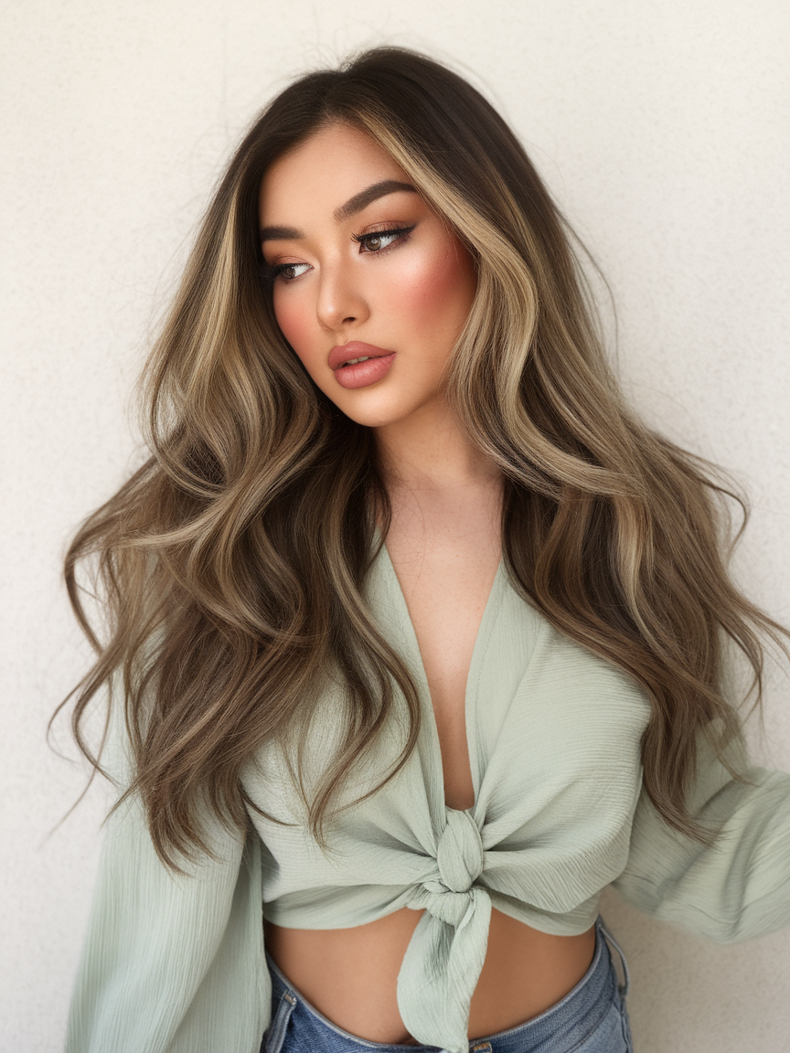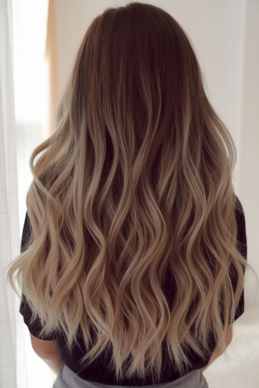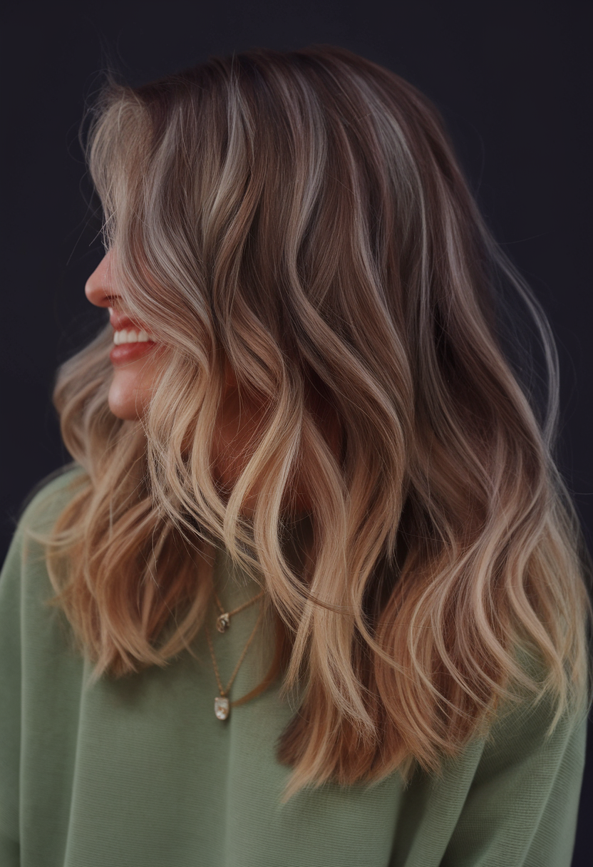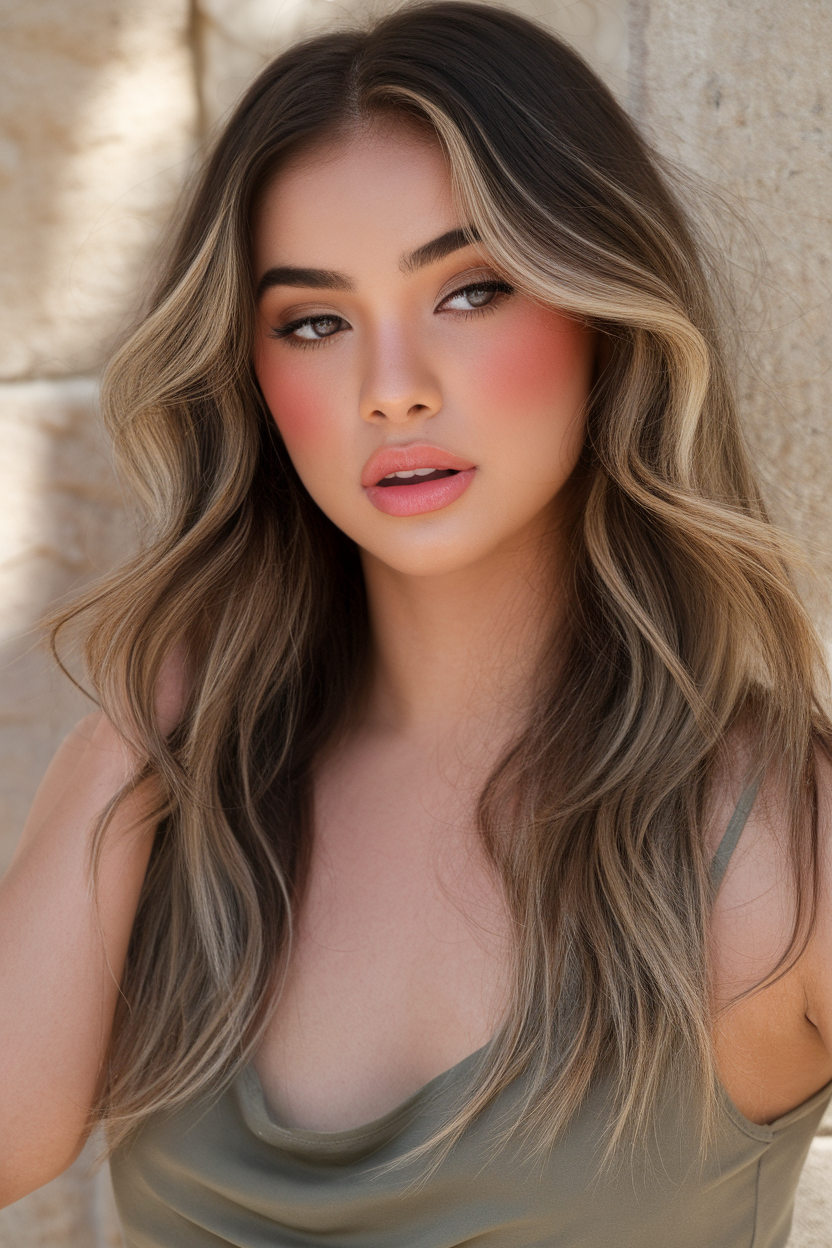 The image shows a fantastic hair design with natural medium brown roots that flawlessly integrate soft blonde highlights throughout the hair. The relaxed waves throughout the length of the hair add dimension while maintaining voluminous movement in the air. This option creates a complementary light effect of balayage that avoids the harsh contrast between different shades. The soft palette works on a variety of skin types and is especially effective for summer looks.