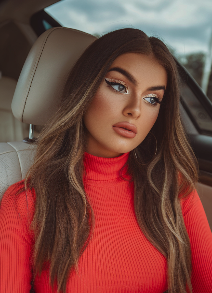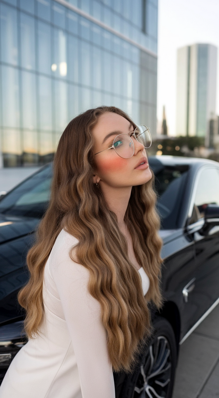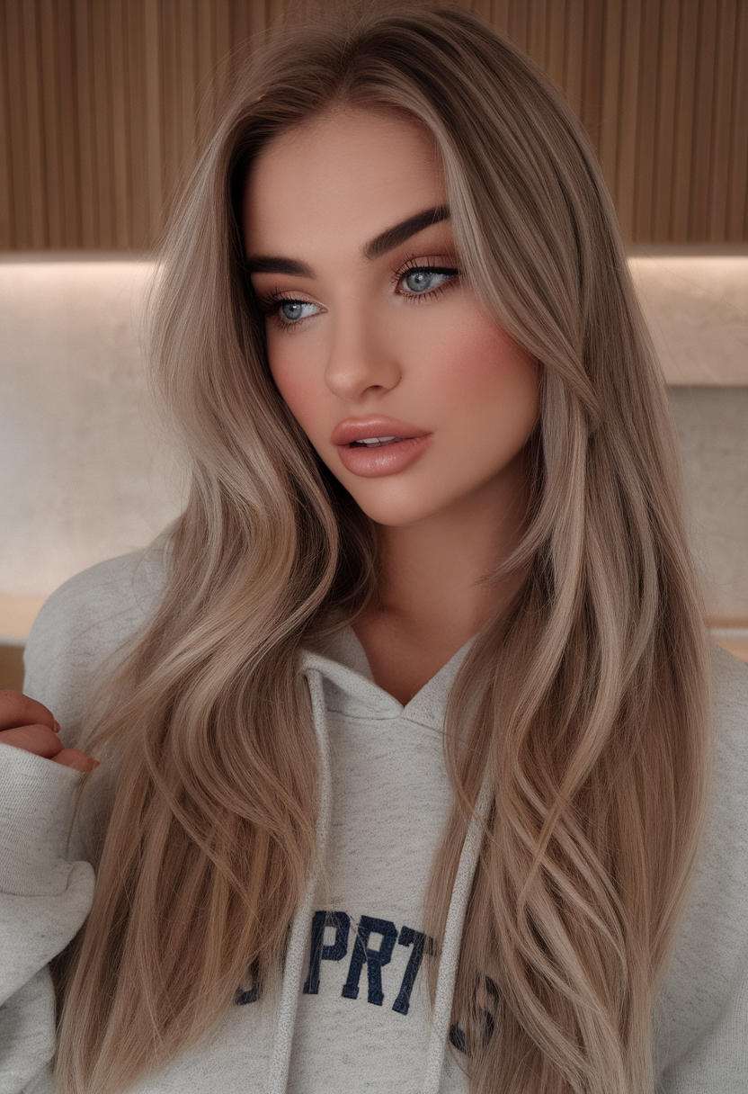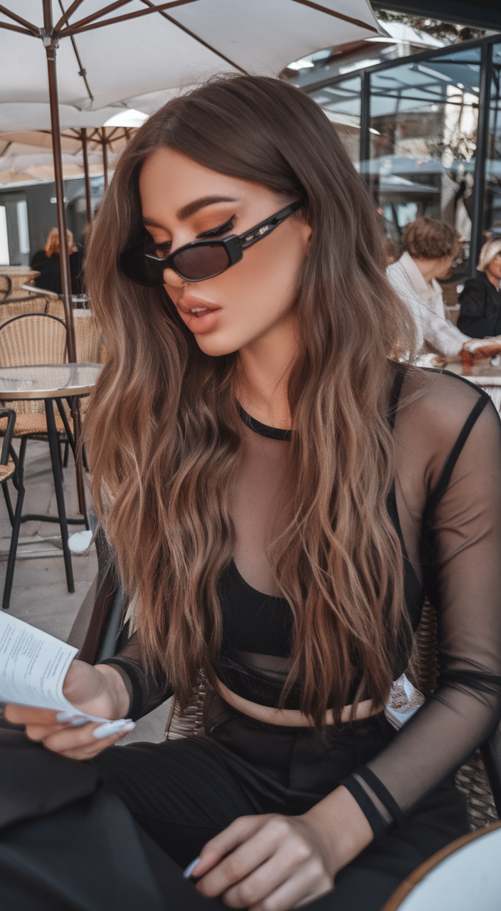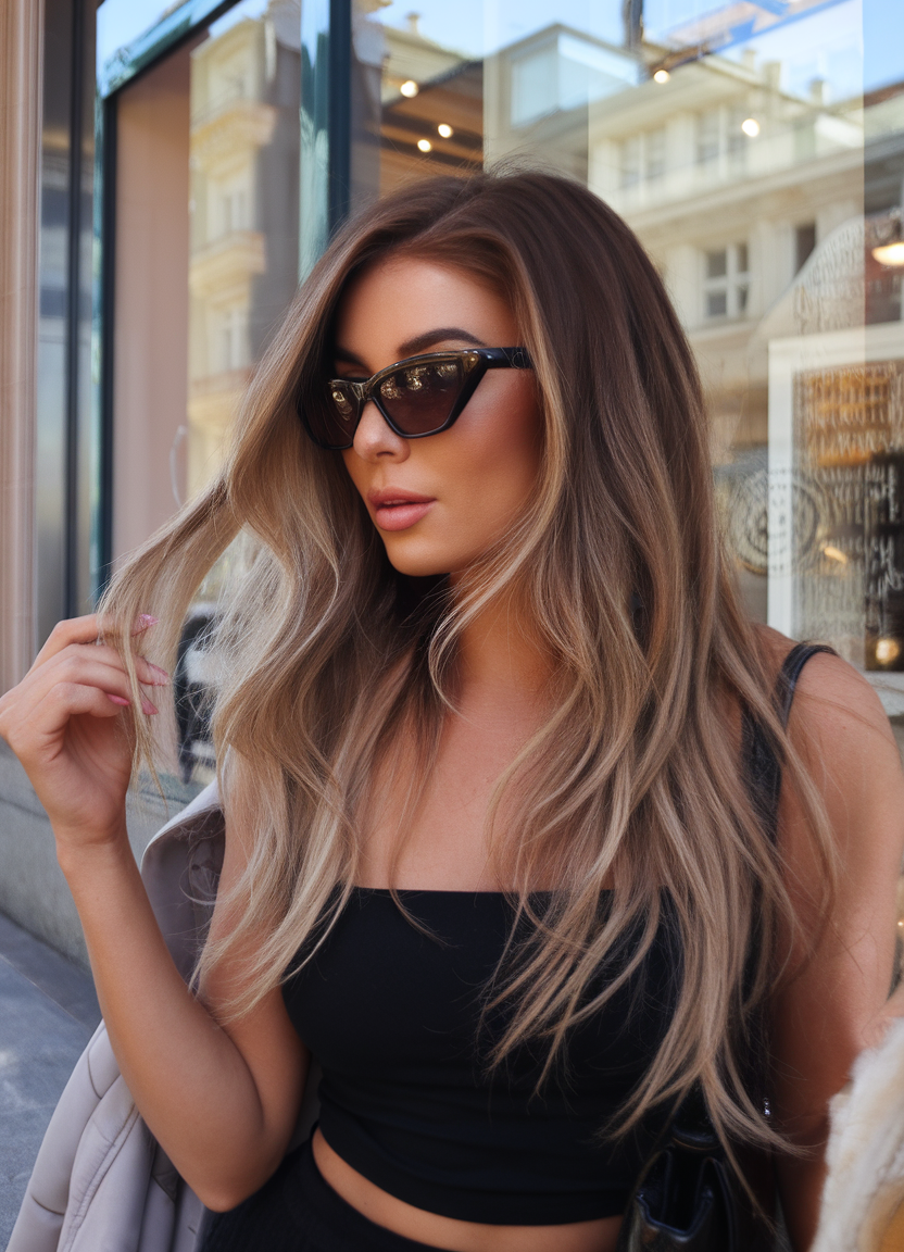 The image shows a fantastic hair design with natural medium brown roots that flawlessly integrate soft blonde highlights throughout the hair. The relaxed waves throughout the length of the hair add dimension while maintaining voluminous movement in the air. This option creates a complementary light effect of balayage that avoids the harsh contrast between different shades. The soft palette works on a variety of skin types and is especially effective for summer looks.
