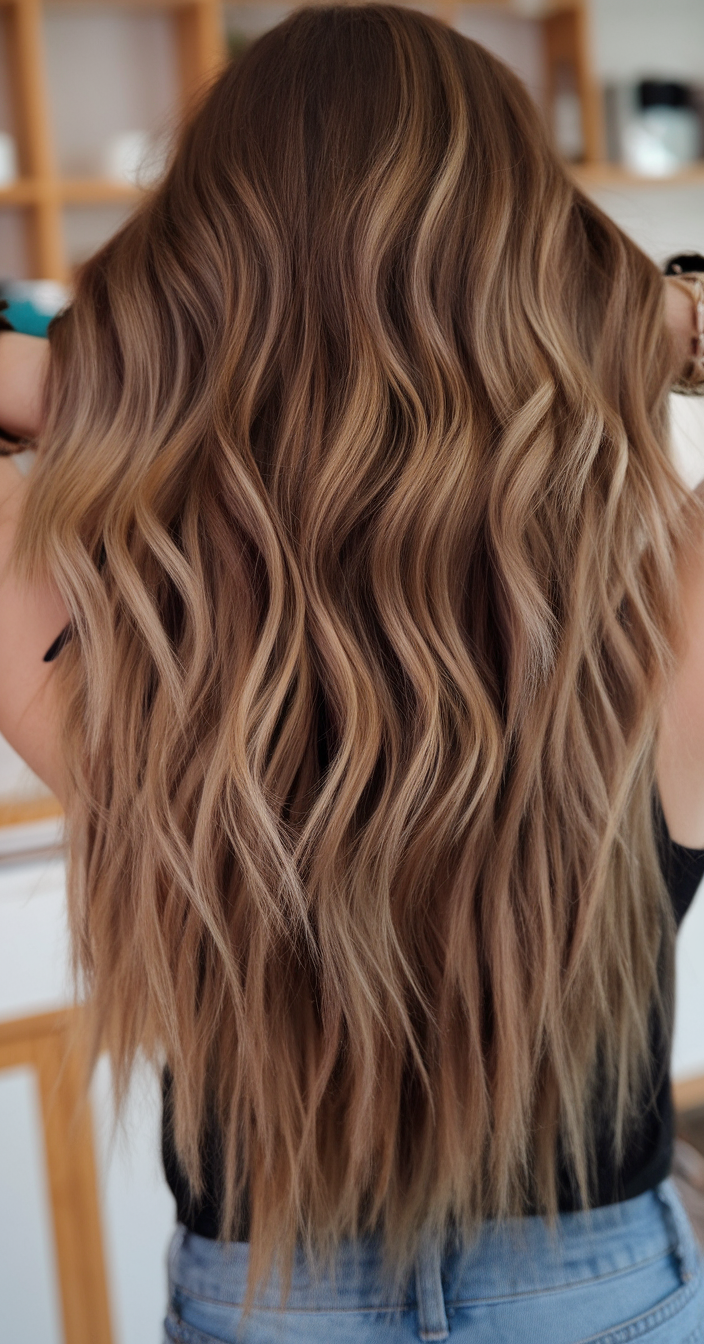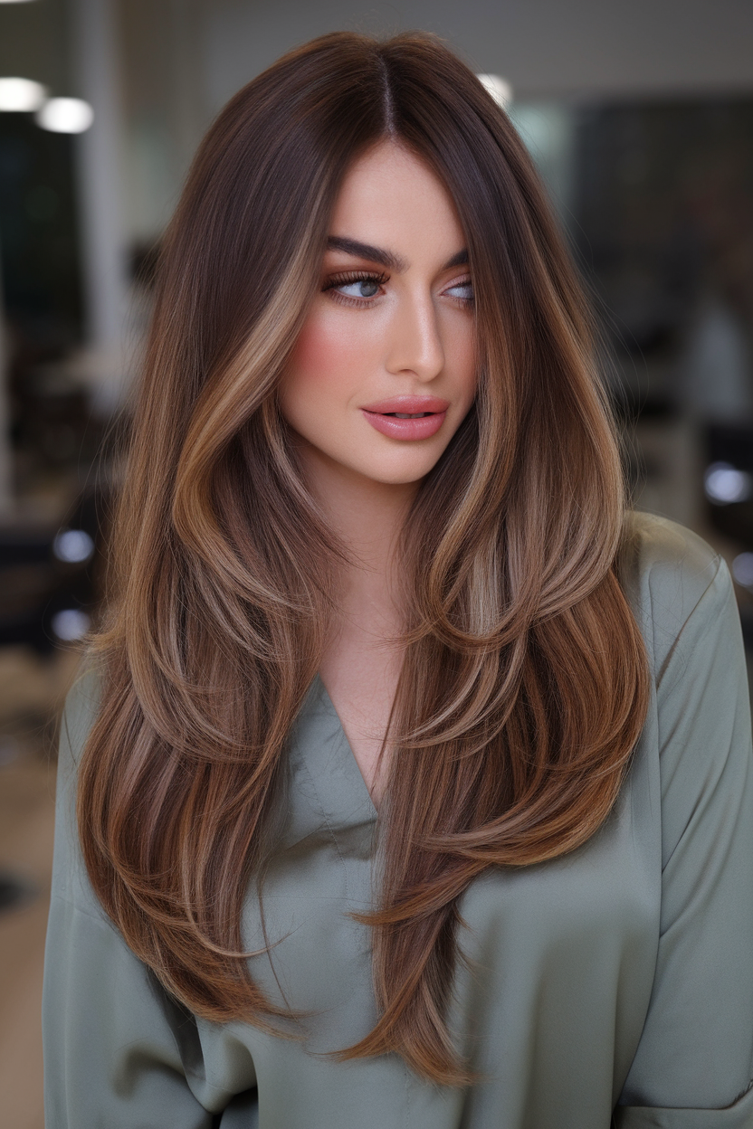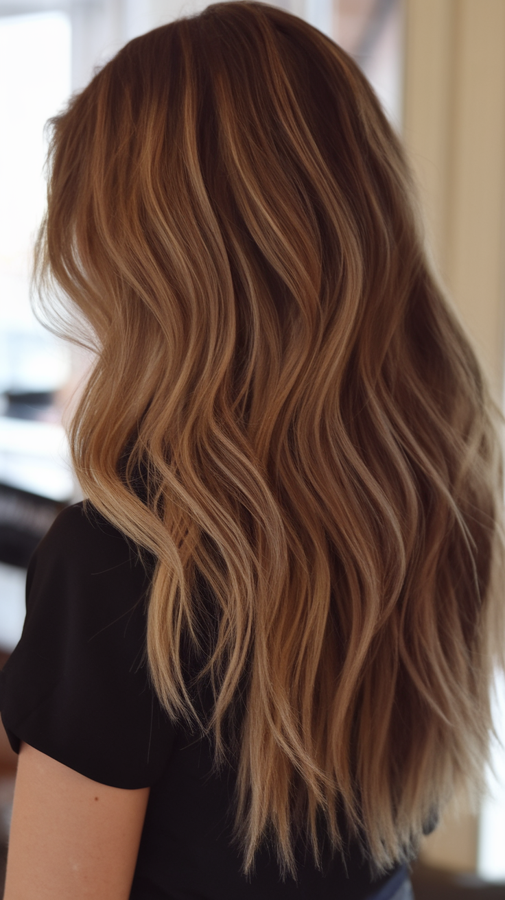 This long haircut features honey tones that create dimensional effects with a soft balayage light application starting in the middle sections. This texture adds body and the different shades of brown add visual interest to all sections. This style allows for effortless summer elegance due to its sun-kissed appearance. People with this style achieve a vibrant look without extensive maintenance.