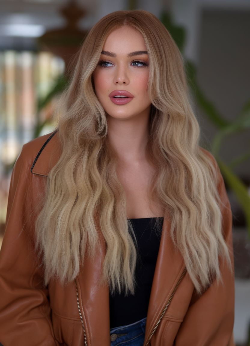 The long, soft waves of this shade have a rich mocha base with subtle milky shades that create a shimmering effect when exposed to light. The shaded color movement transitions seamlessly from darker hair at the roots to lighter golden tones in the mid-sections, creating both depth and bright highlights in one look. People looking for an organic-transformative look will find their perfect match in this polished look. A dreamy and fun choice for the warmer months.